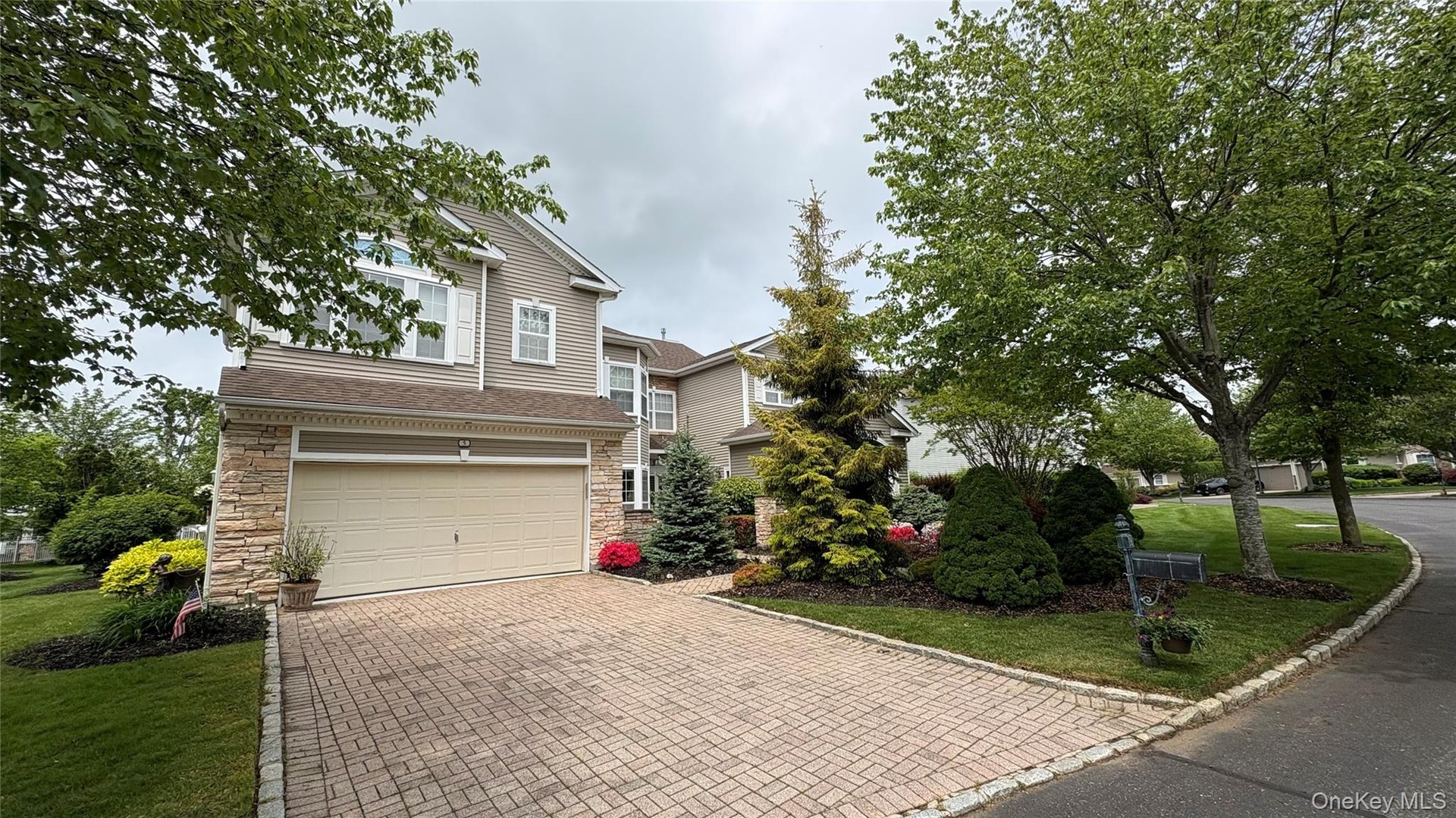 - View of front of home with stone siding, an attached garage, decorative driveway, and a front lawn