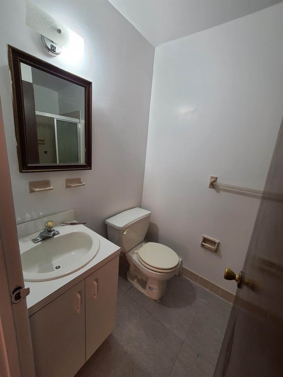 - Bathroom with toilet, vanity, a stall shower, and tile patterned flooring