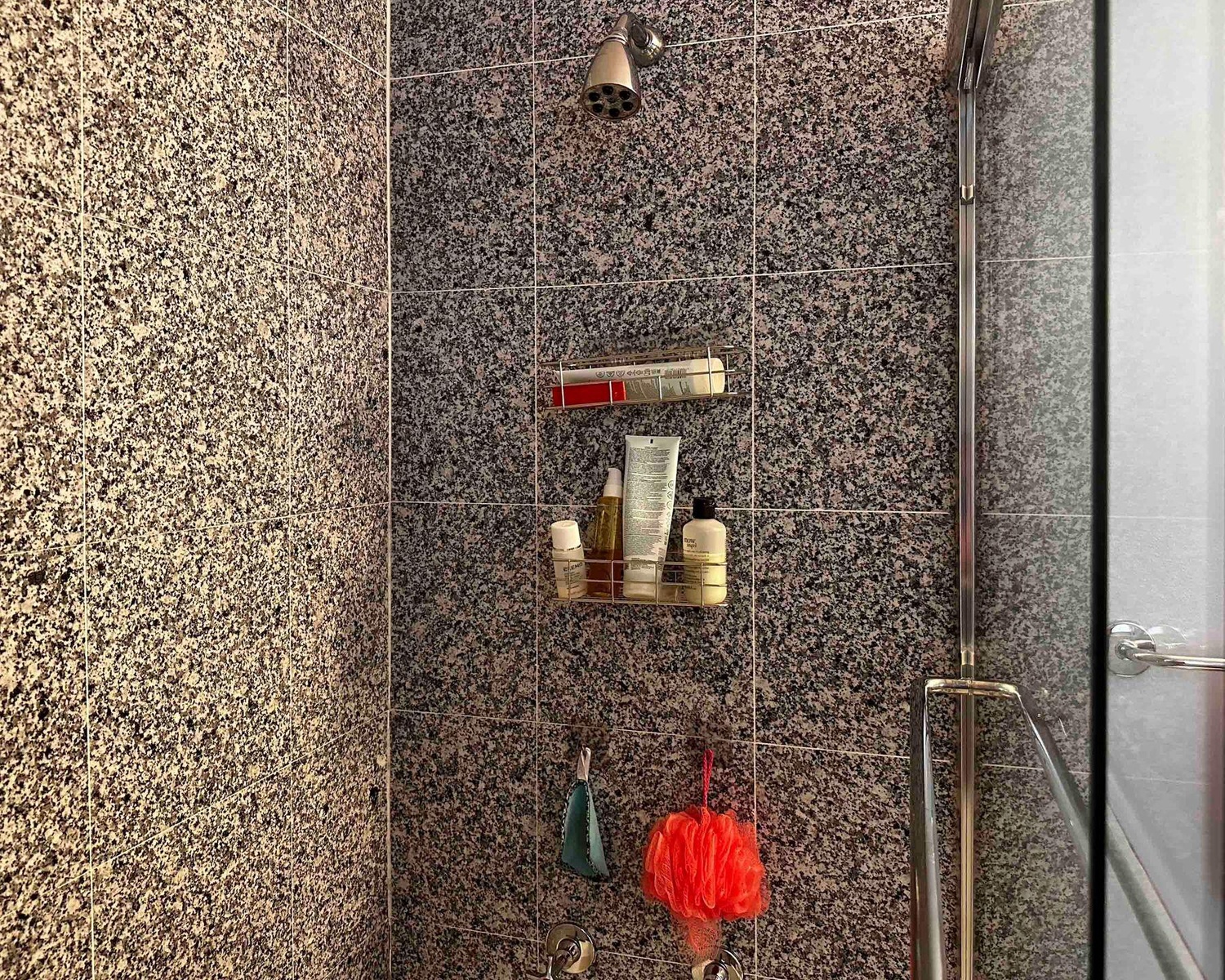 - Bathroom view of a tile shower