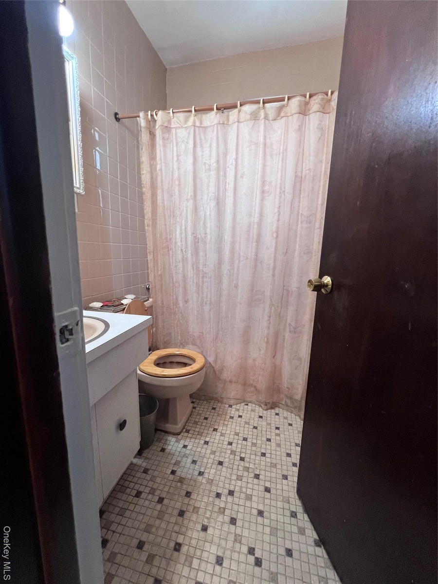 - Full bath featuring tile walls, vanity, curtained shower, and tile patterned floors