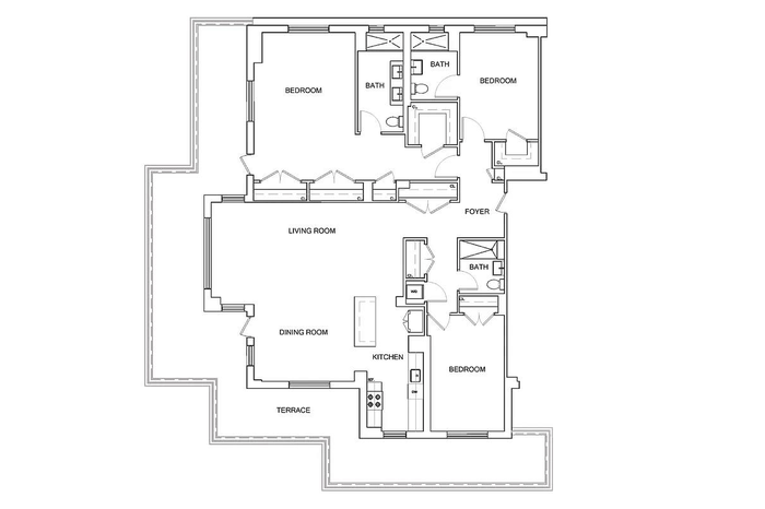 This is a very special penthouse-like three bedroom residence perfect for entertaining, on a very quiet high floor, with very few neighbors, triple (south, east and west ) exposures, a dramatic wrap-around terrace with mesmerizing views of the city and the midtown skyline, which is accessible from the living room as well as from the master bedroom.