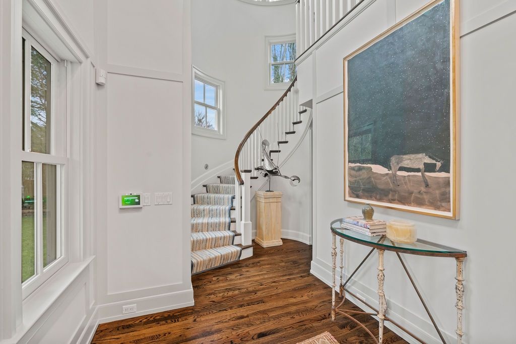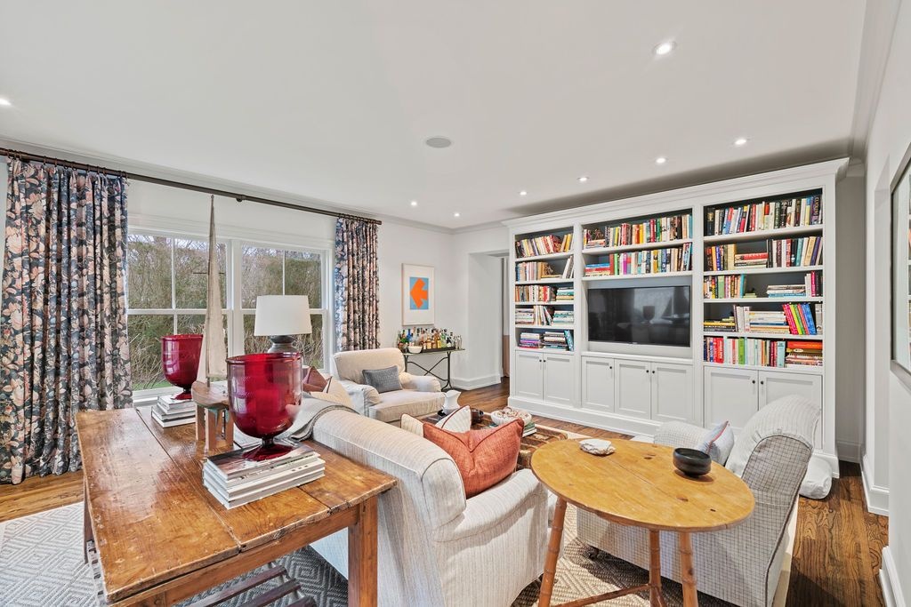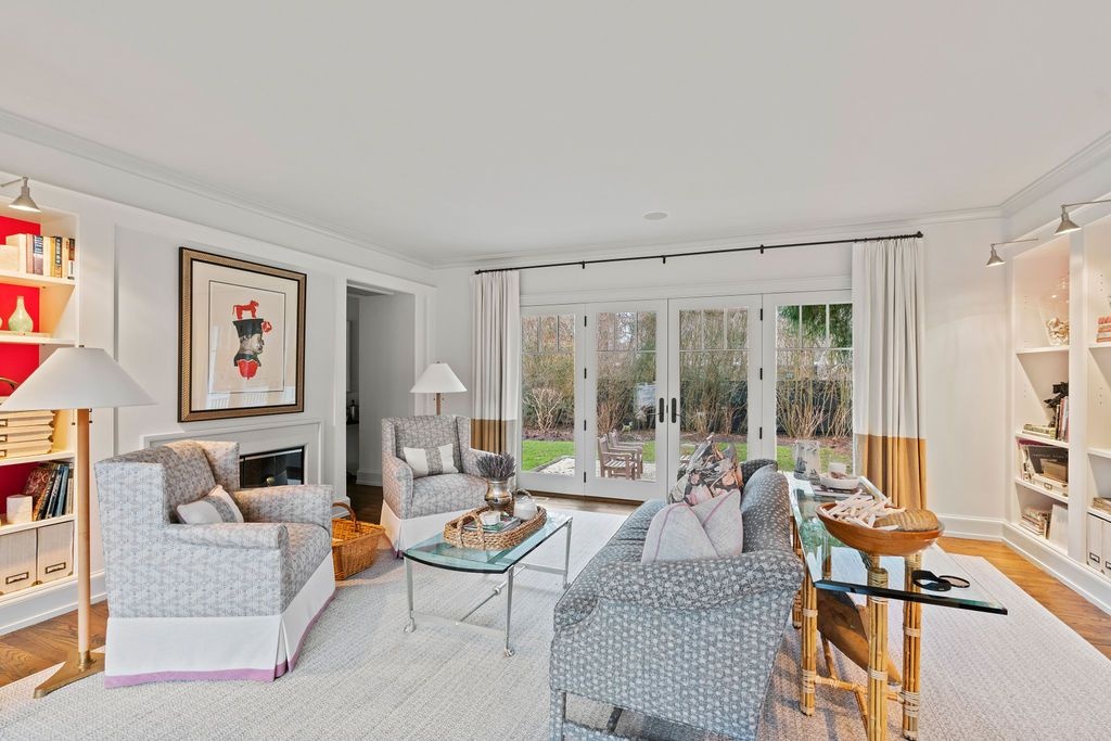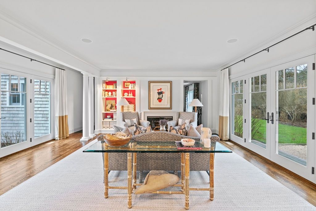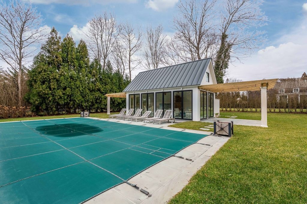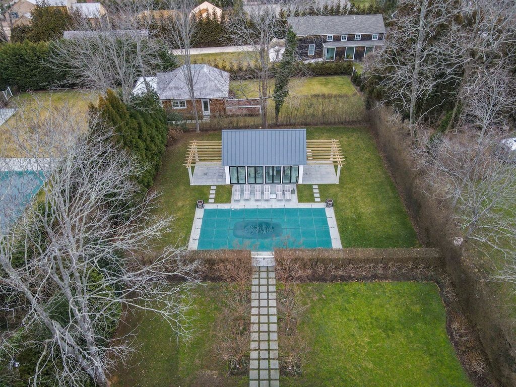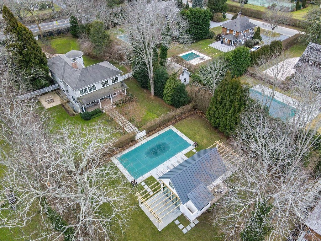 Impressive Bruce Nagel designed and professionally decorated Bridgehampton Village home with dramatic entry foyer with sweeping stairway, 2 master bedrooms overlooking the expansive rear yard and 2 guest bedrooms with an exquisitely outfitted bath, formal living room with fireplace, family room with flat screen TV and a professional kitchen with adjacent dining. Enjoy entertaining on the stone patio off of the formal living area or relax on the covered rear porch and pool all while enjoying the indoor/outdoor audio system. A newly added pool house and two pergolas round out this offering. Near to ocean beaches and village restaurants and shops!