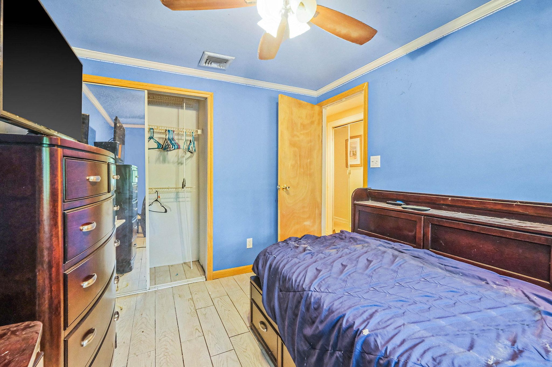 - Bedroom featuring ornamental molding, light wood-style flooring, ceiling fan, and baseboards