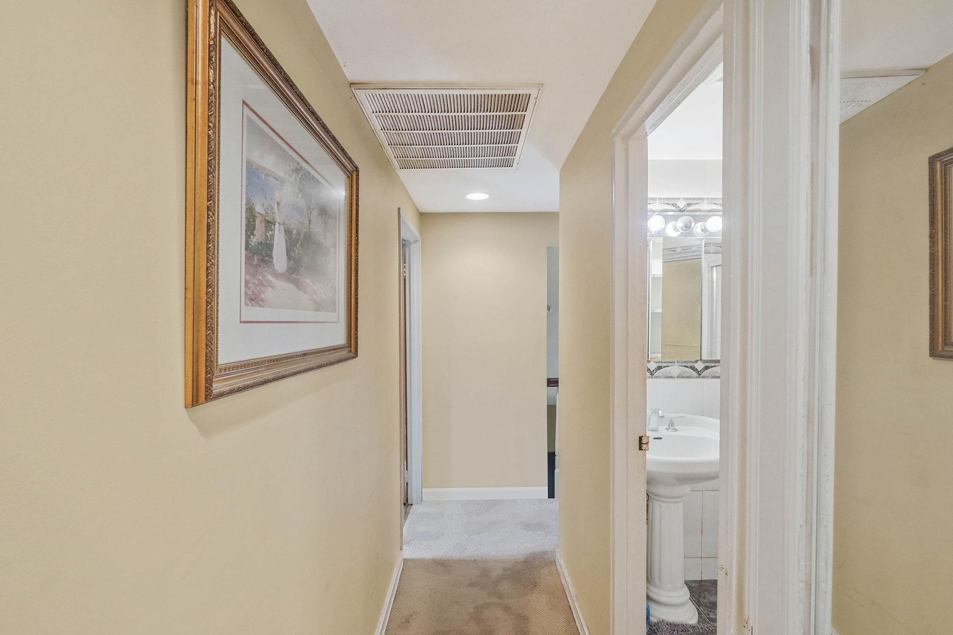 - Hallway featuring carpet floors, recessed lighting, and baseboards