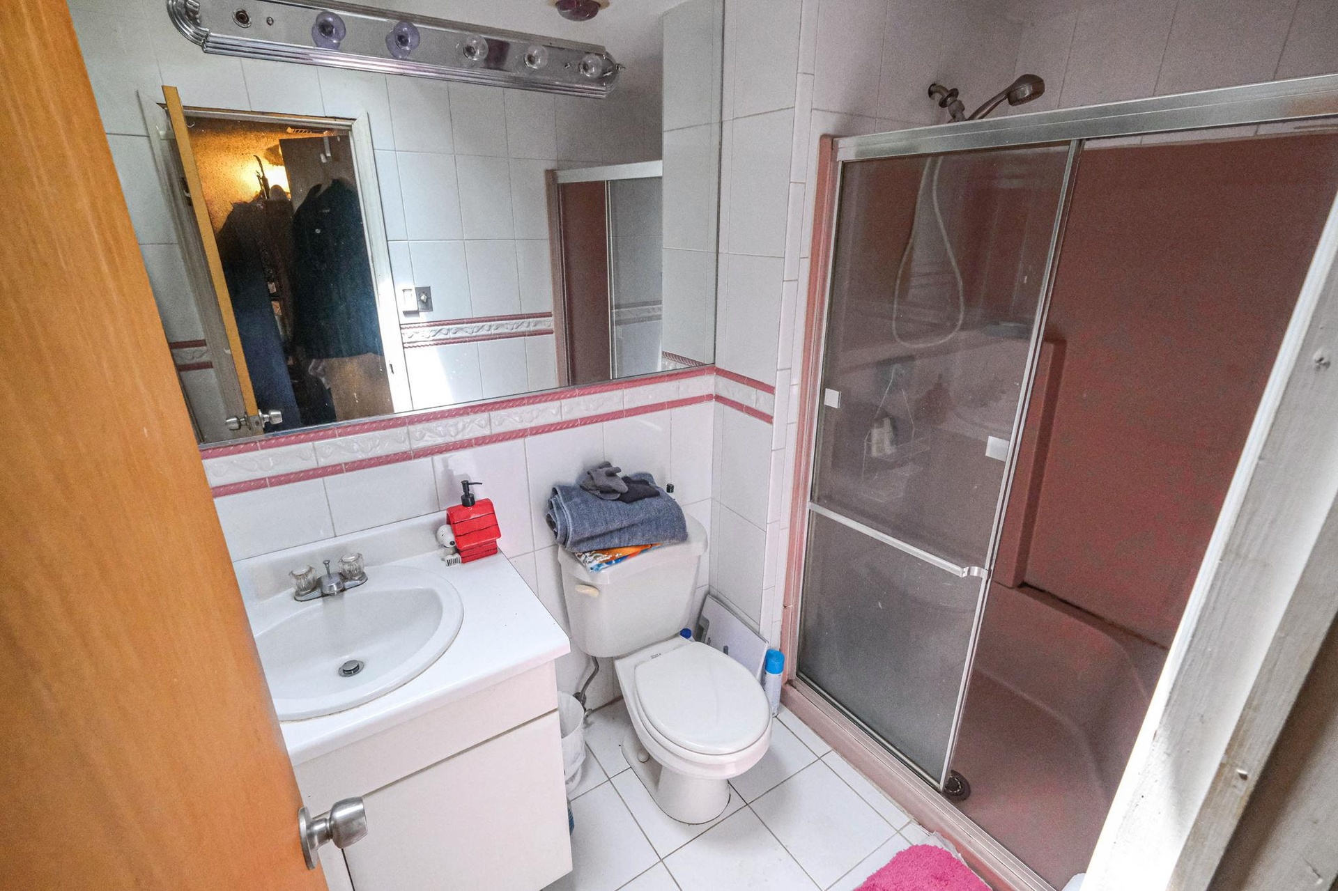 - Bathroom with tile walls, a stall shower, tile patterned flooring, vanity, and toilet