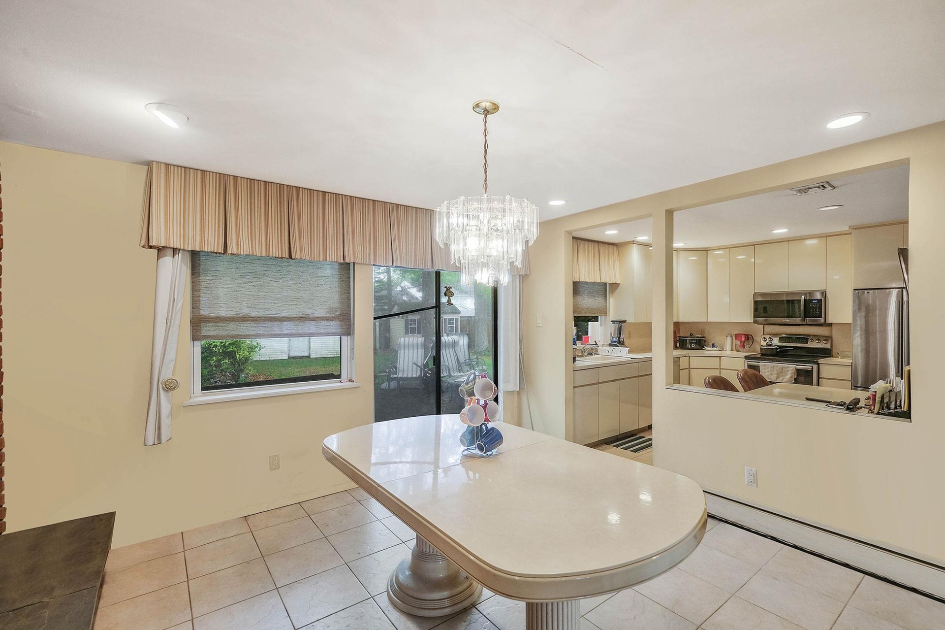 - Dining space with a chandelier, light tile patterned flooring, and recessed lighting