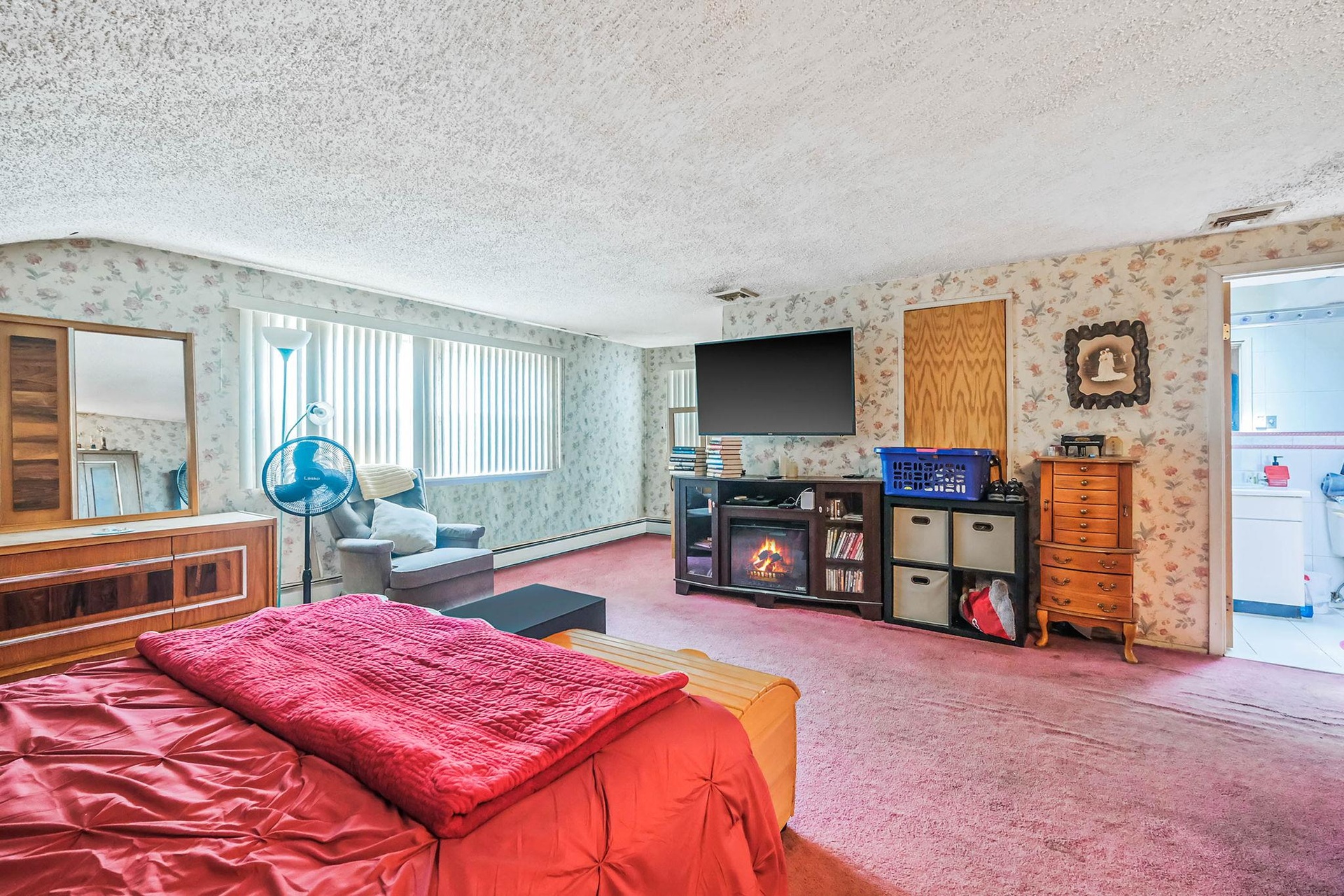 - Bedroom featuring wallpapered walls, a textured ceiling, baseboard heating, a glass covered fireplace, and carpet