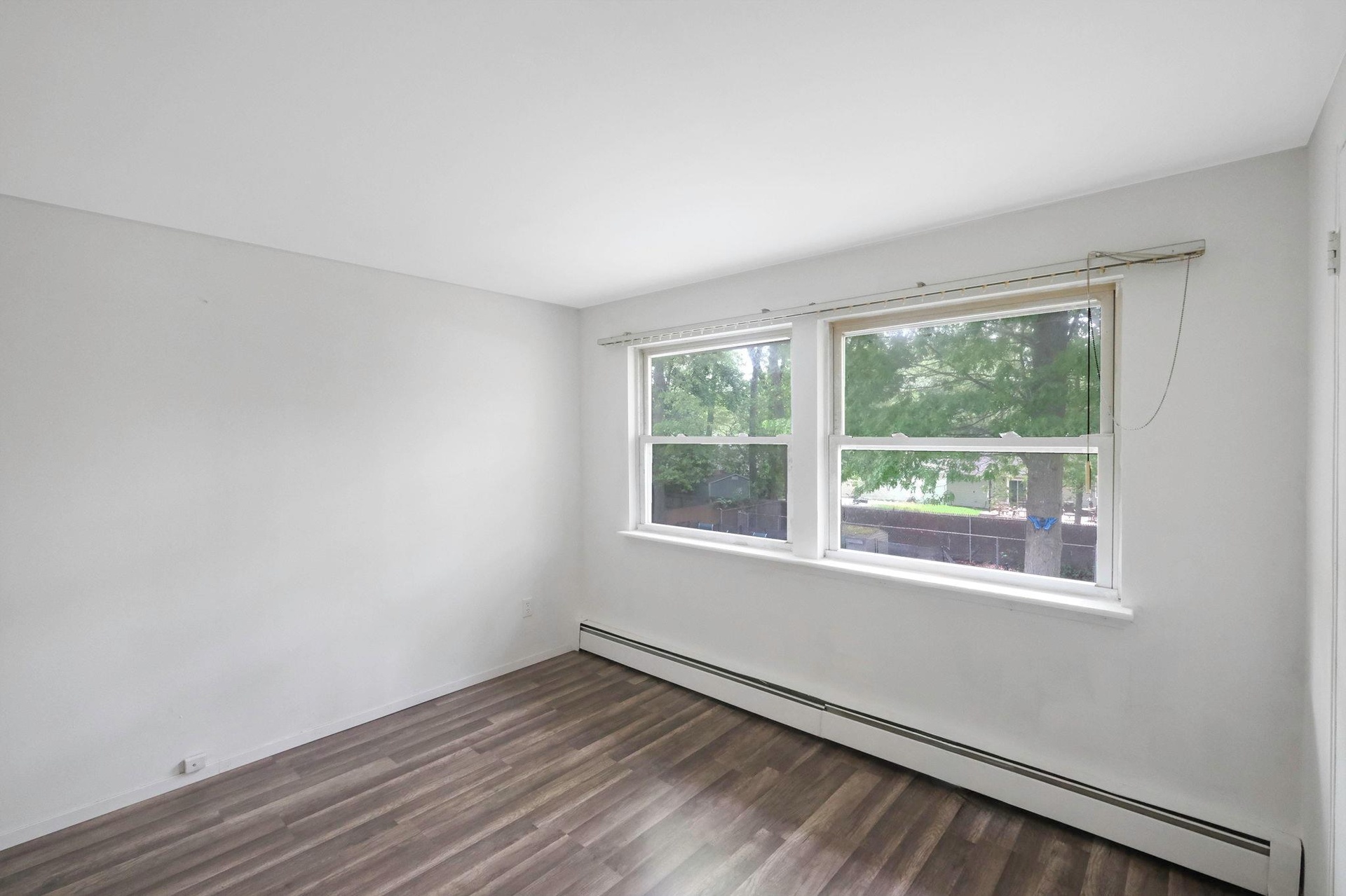 - Empty room featuring a baseboard heating unit and dark wood-type flooring