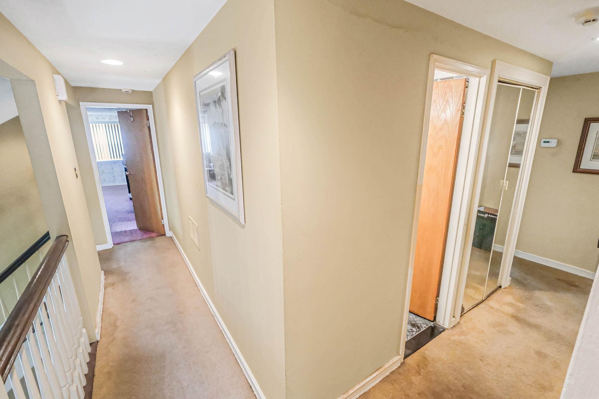 - Hall with carpet floors, an upstairs landing, and baseboards