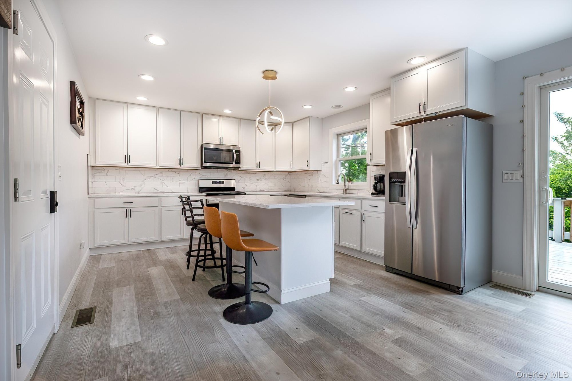- Open-concept kitchen and family room designed for modern living, boasting quartz countertops and sliders leading to a spacious deck—perfect for entertaining or relaxing outdoors. Living room features an electric fireplace.