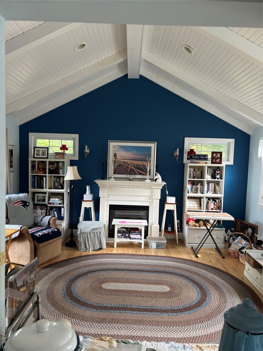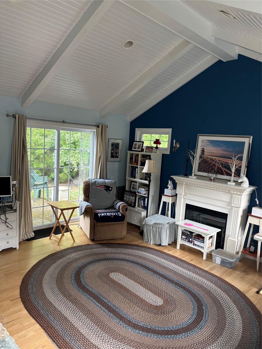 - Den with sliding door to outside patio, beamed high ceilings, with wood finished floors and a fireplace