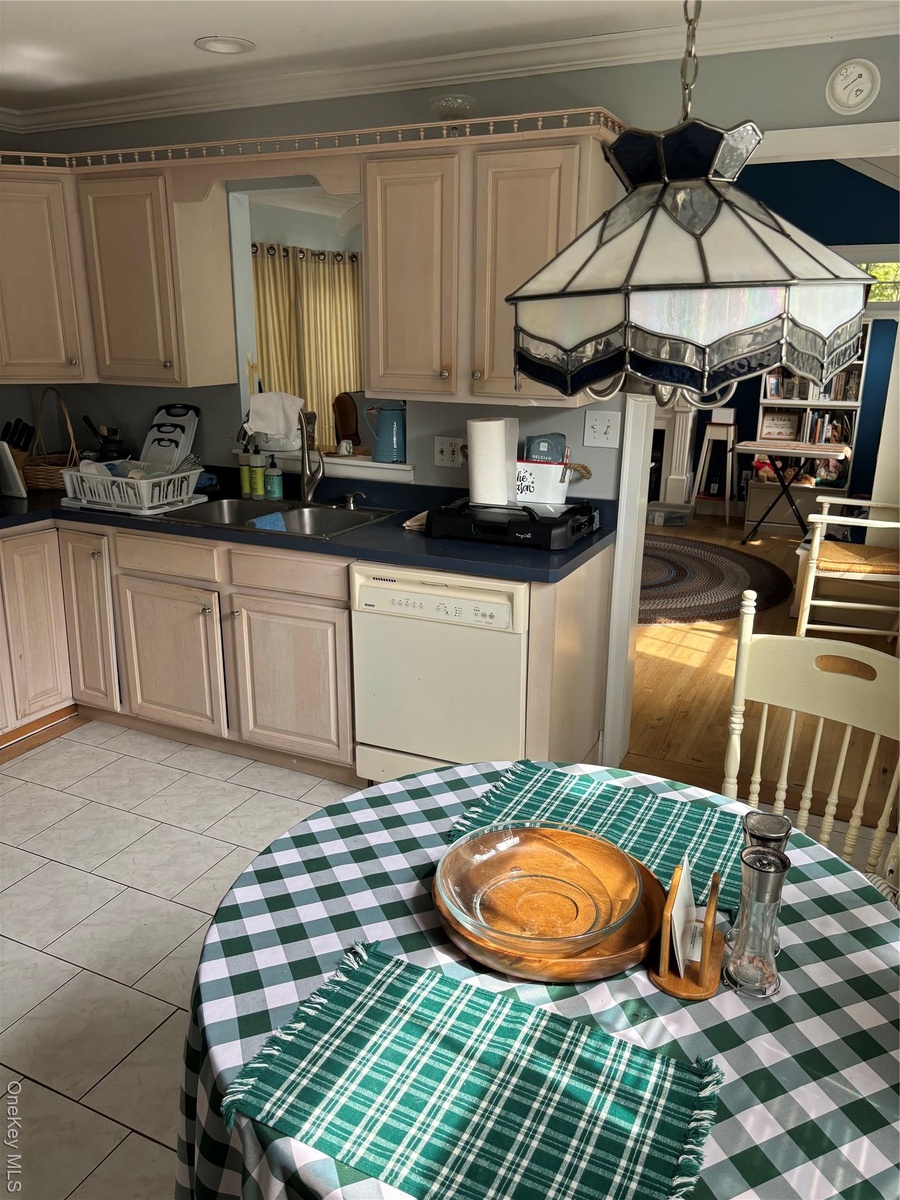 - Kitchen with white dishwasher, a sink, dark countertops, ornamental molding, and light tile patterned flooring