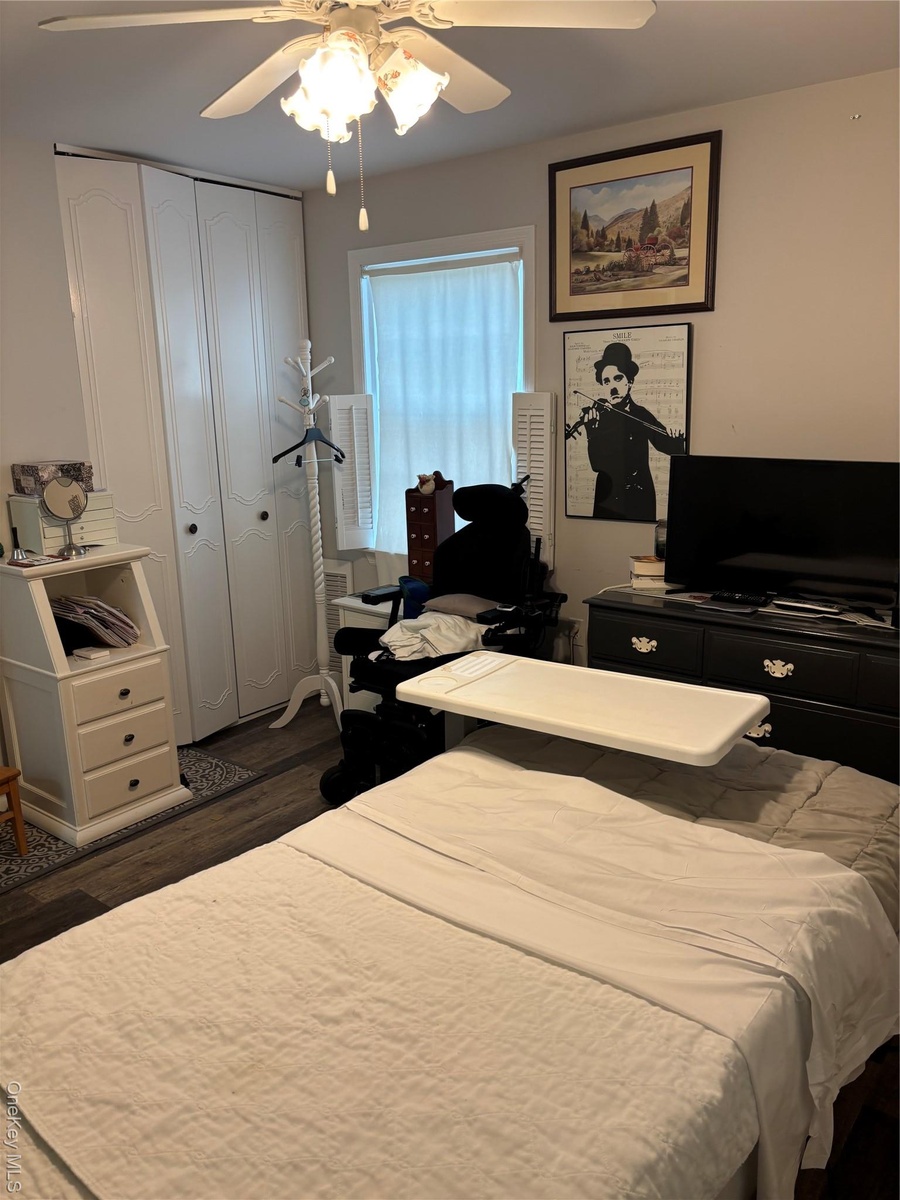 - Bedroom with dark wood-style floors, a closet, ceiling fan, and an office area