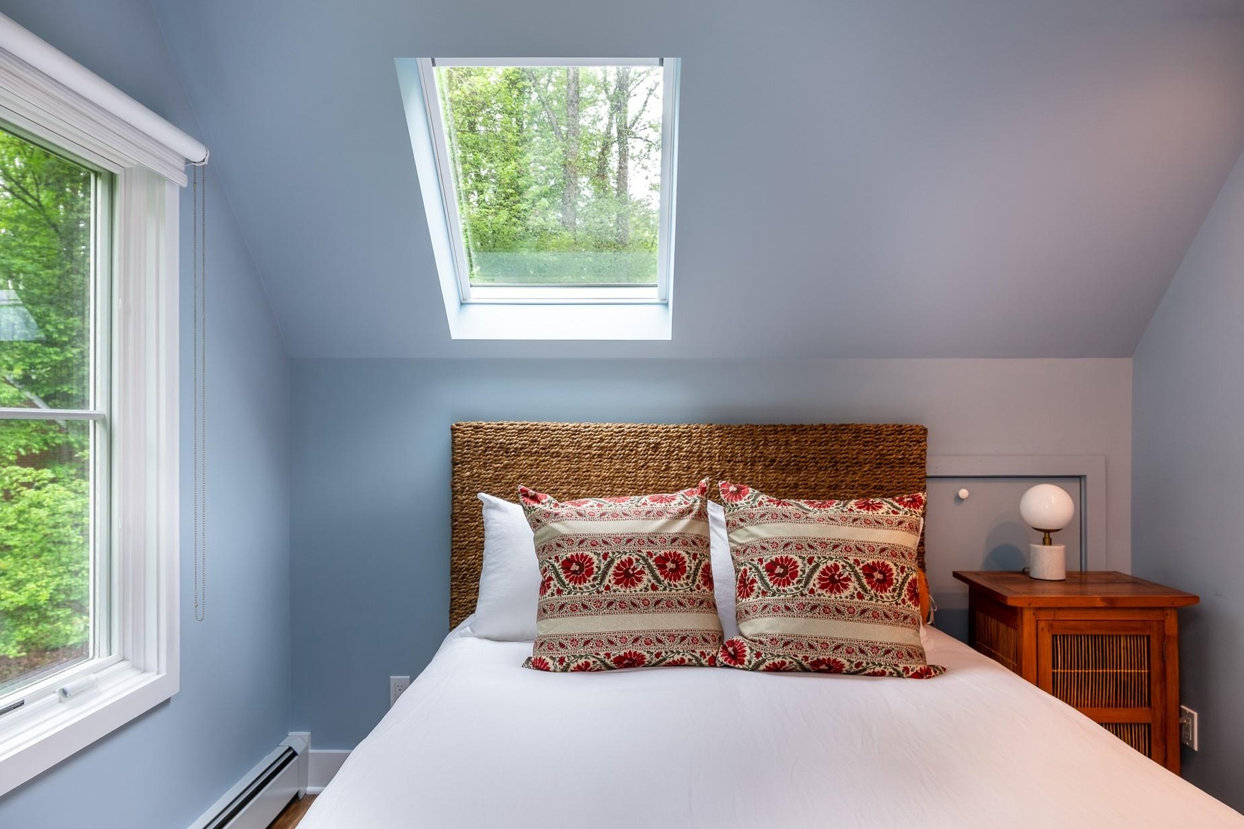- Bedroom with baseboard heating, vaulted ceiling, and a skylight