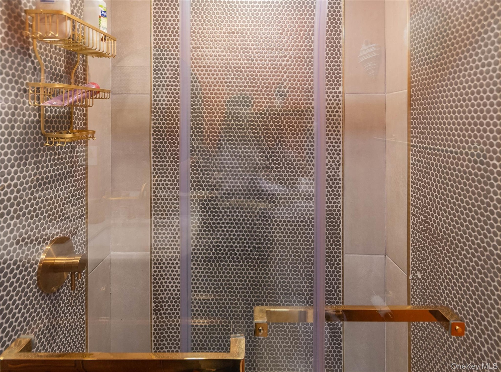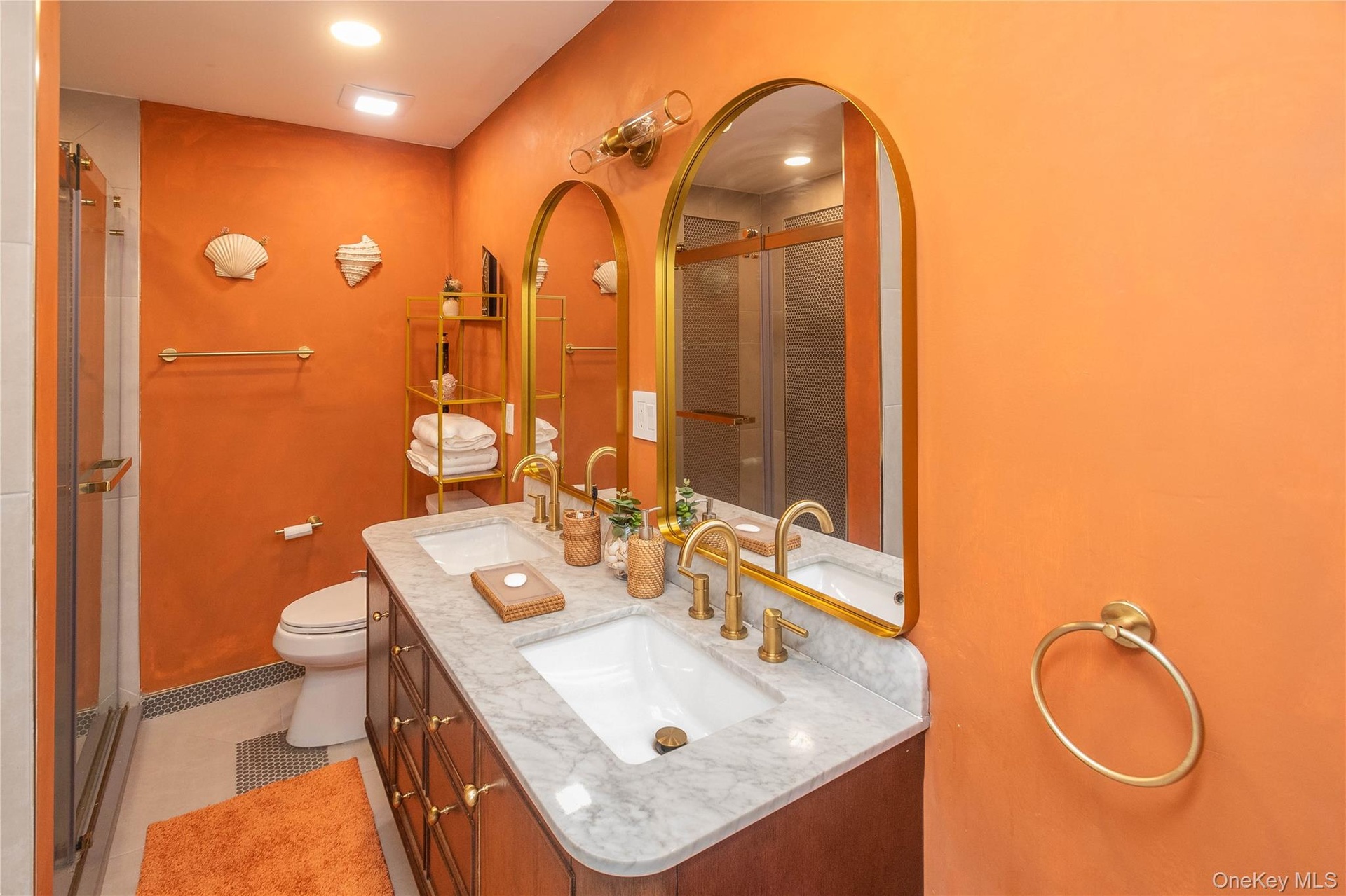 - Full bathroom with a stall shower, double vanity, toilet, and tile patterned flooring