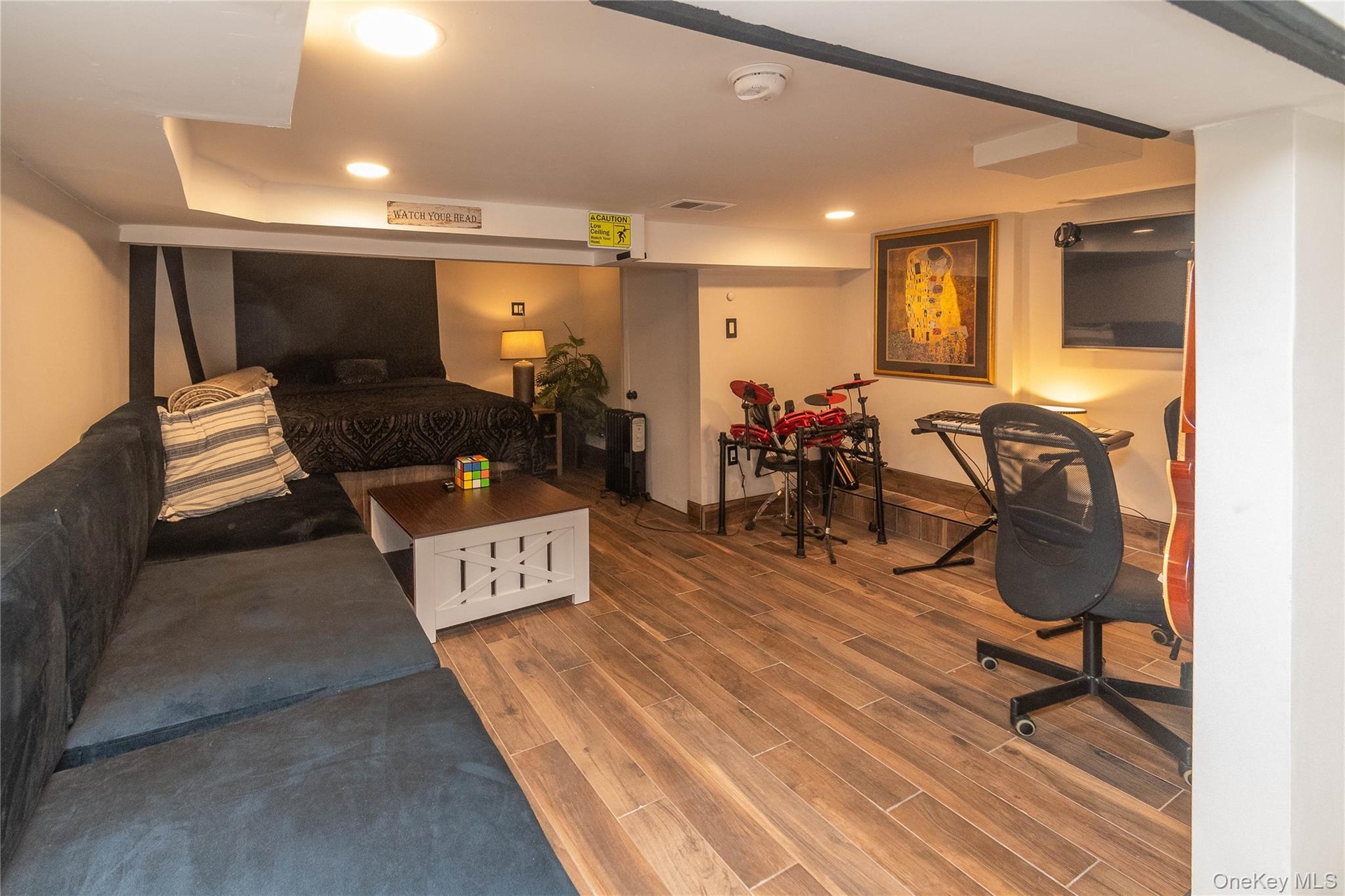 - Living room featuring wood finished floors, recessed lighting, and baseboards