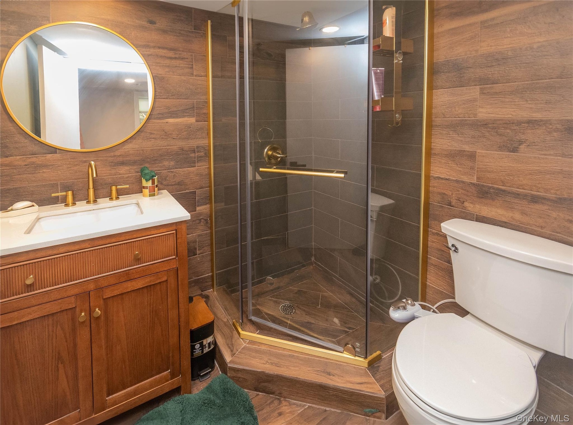 - Bathroom with vanity, toilet, a stall shower, and wood walls