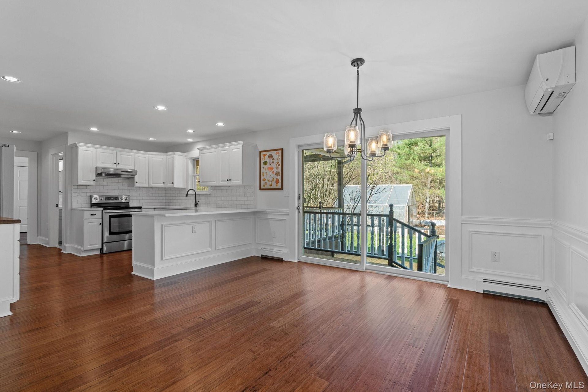 - Dining area featuring a wall mounted air conditioner, a baseboard heating unit, dark wood finished floors, a chandelier, and recessed lighting