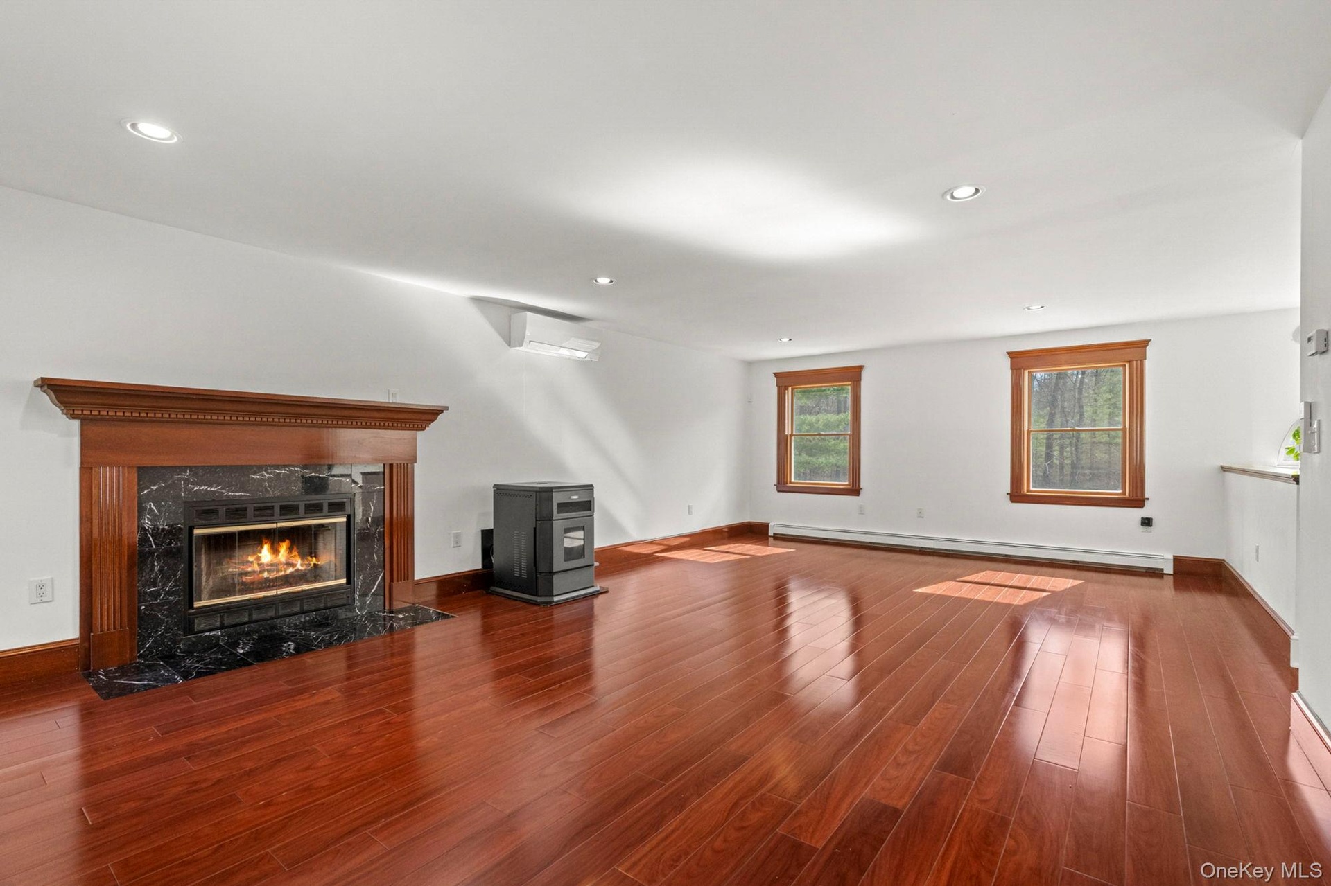 - Unfurnished living room with a wall unit AC, wood finished floors, recessed lighting, a fireplace, and a baseboard radiator
