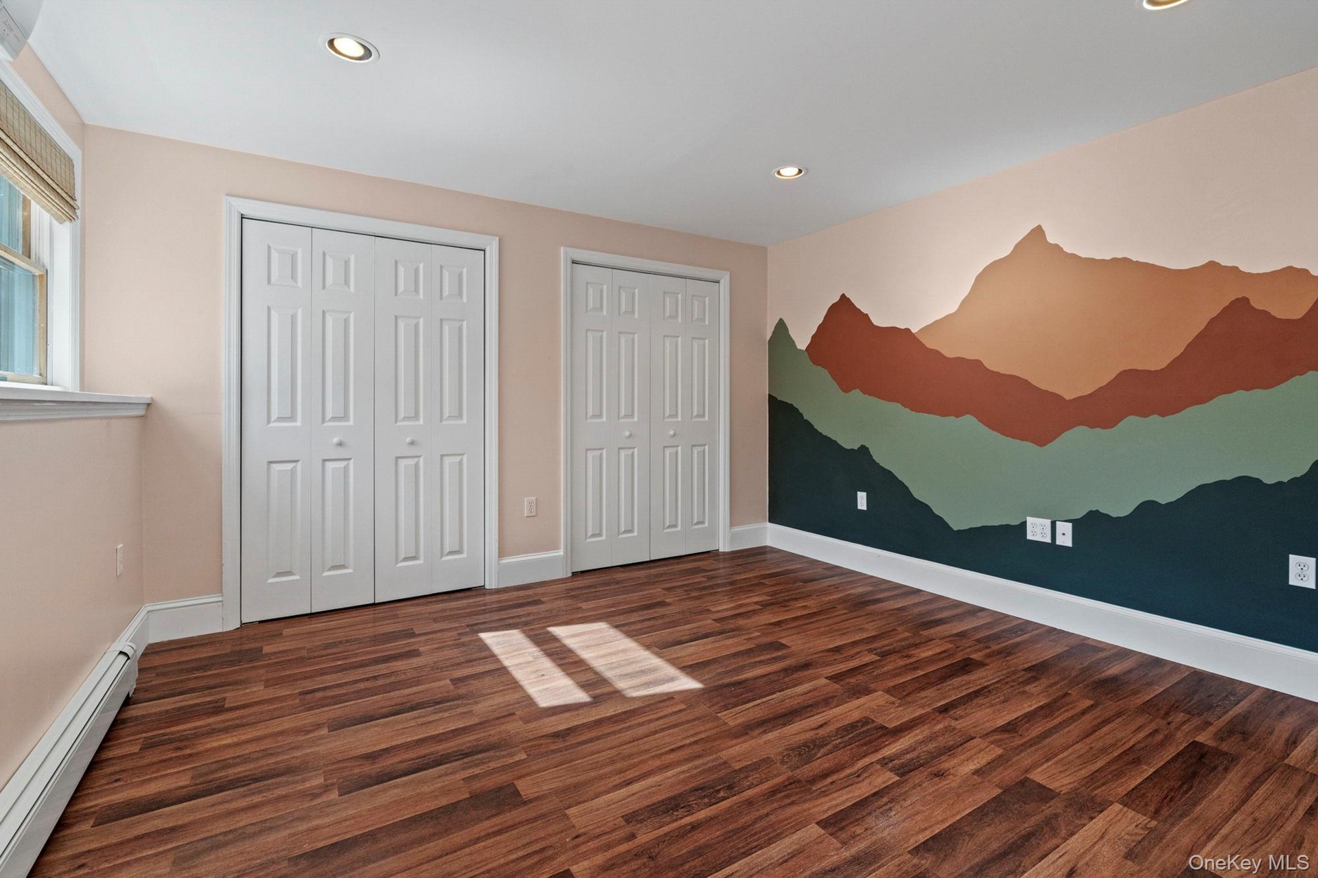 - Unfurnished bedroom with baseboard heating, multiple closets, wood finished floors, recessed lighting, and baseboards