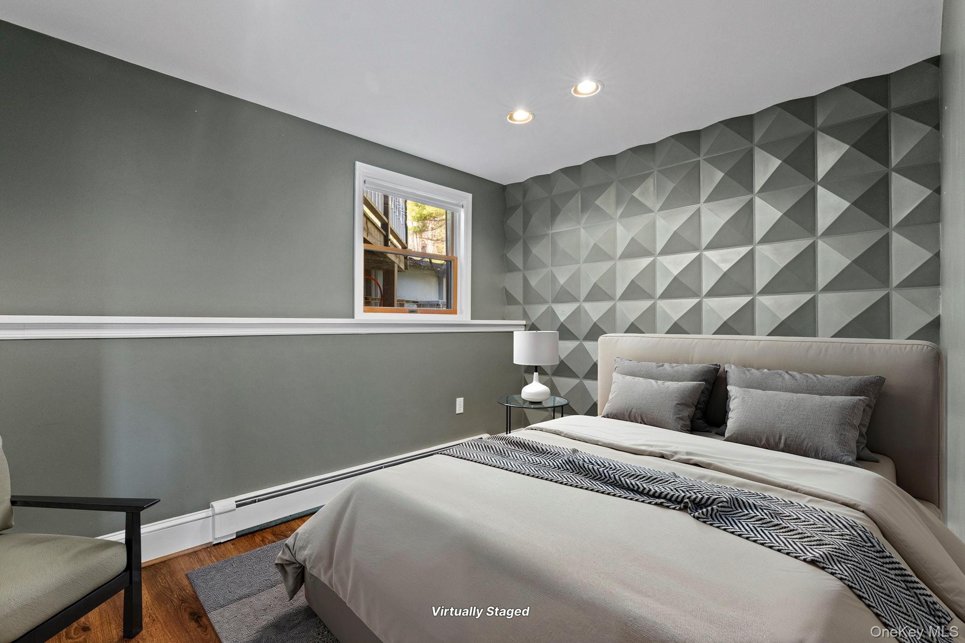 - Bedroom featuring an accent wall, recessed lighting, a baseboard heating unit, wood finished floors, and baseboards