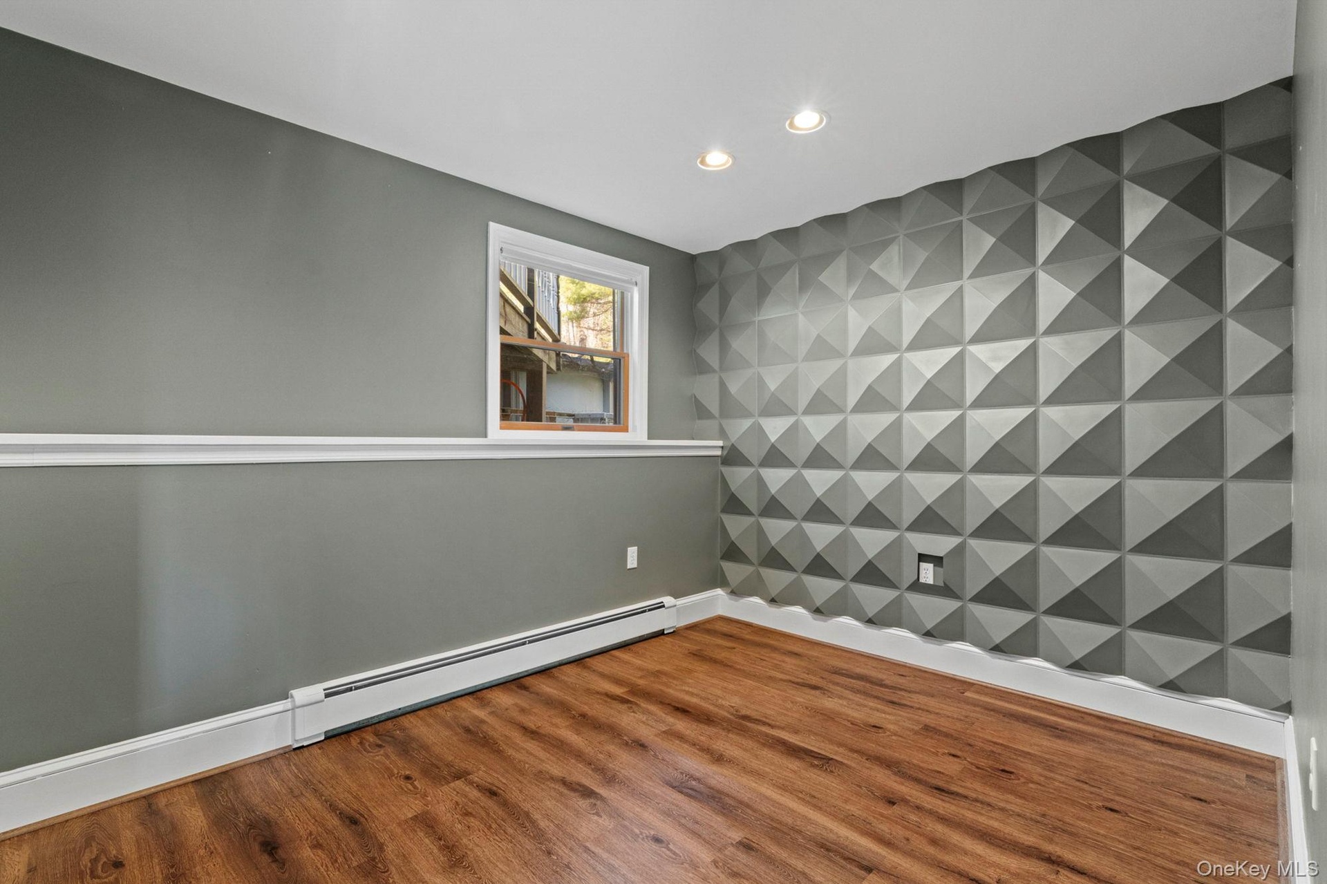 - Empty room featuring baseboard heating, recessed lighting, wood finished floors, baseboards, and an accent wall