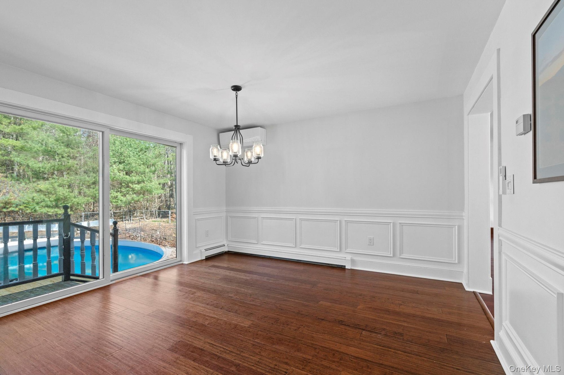 - Unfurnished dining area with a chandelier, wainscoting, baseboard heating, dark wood-style floors, and a decorative wall