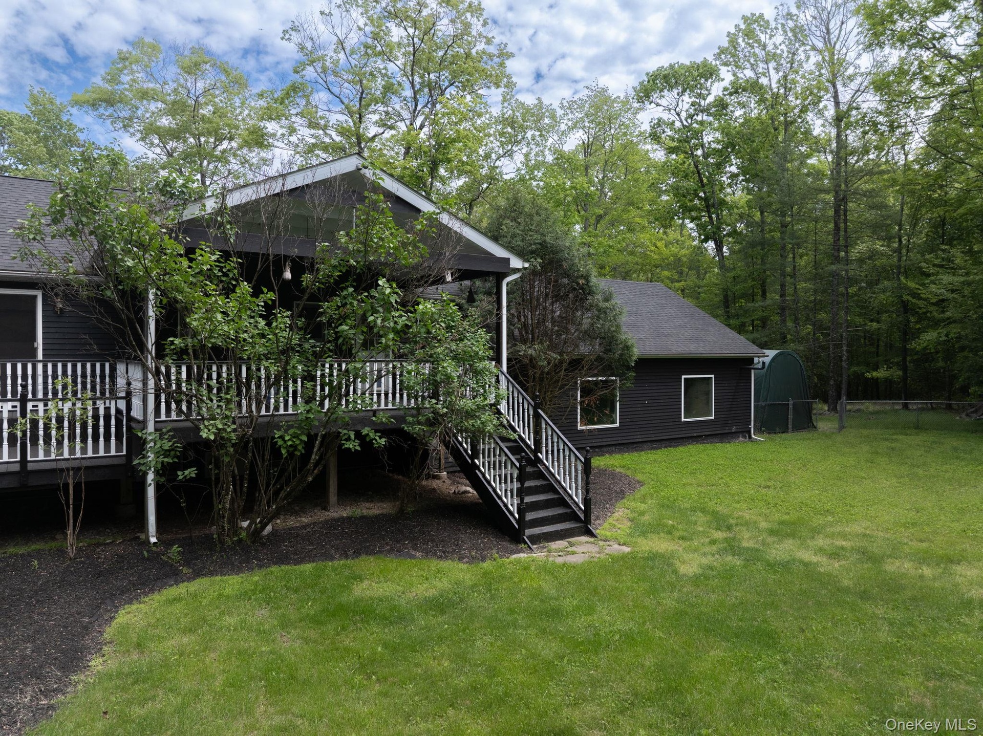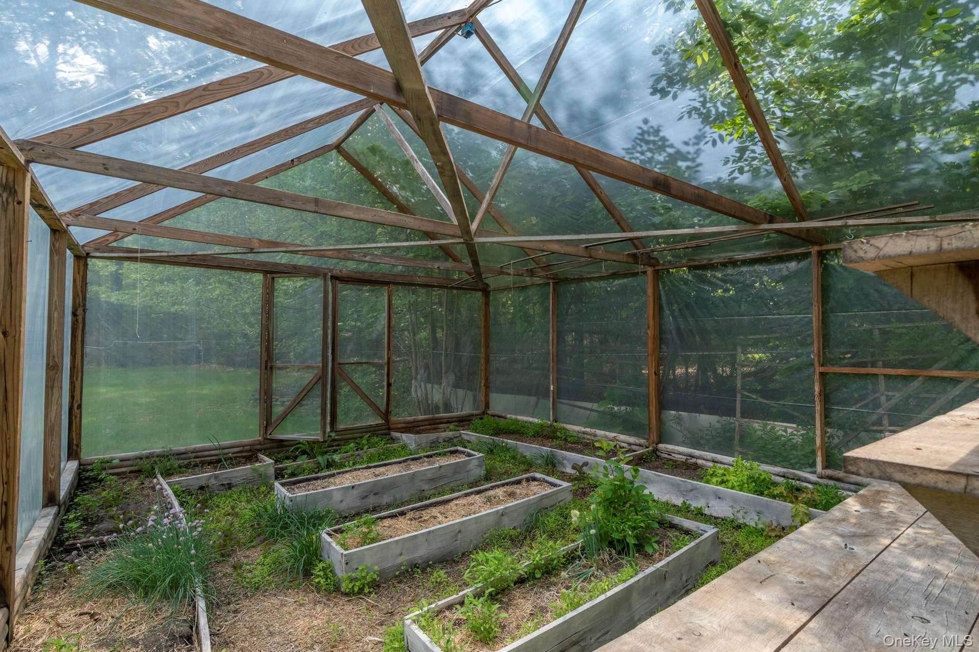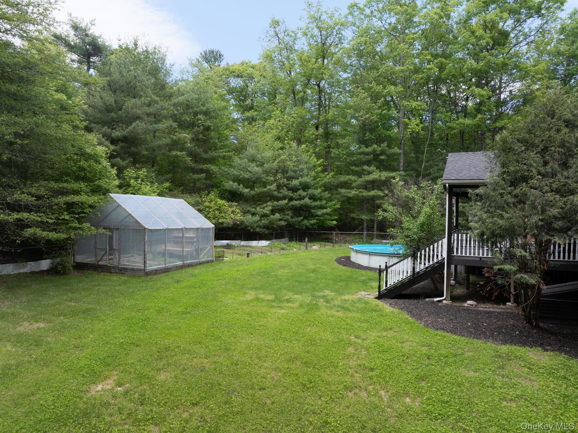 - View of yard featuring a greenhouse, an outbuilding, and an outdoor pool