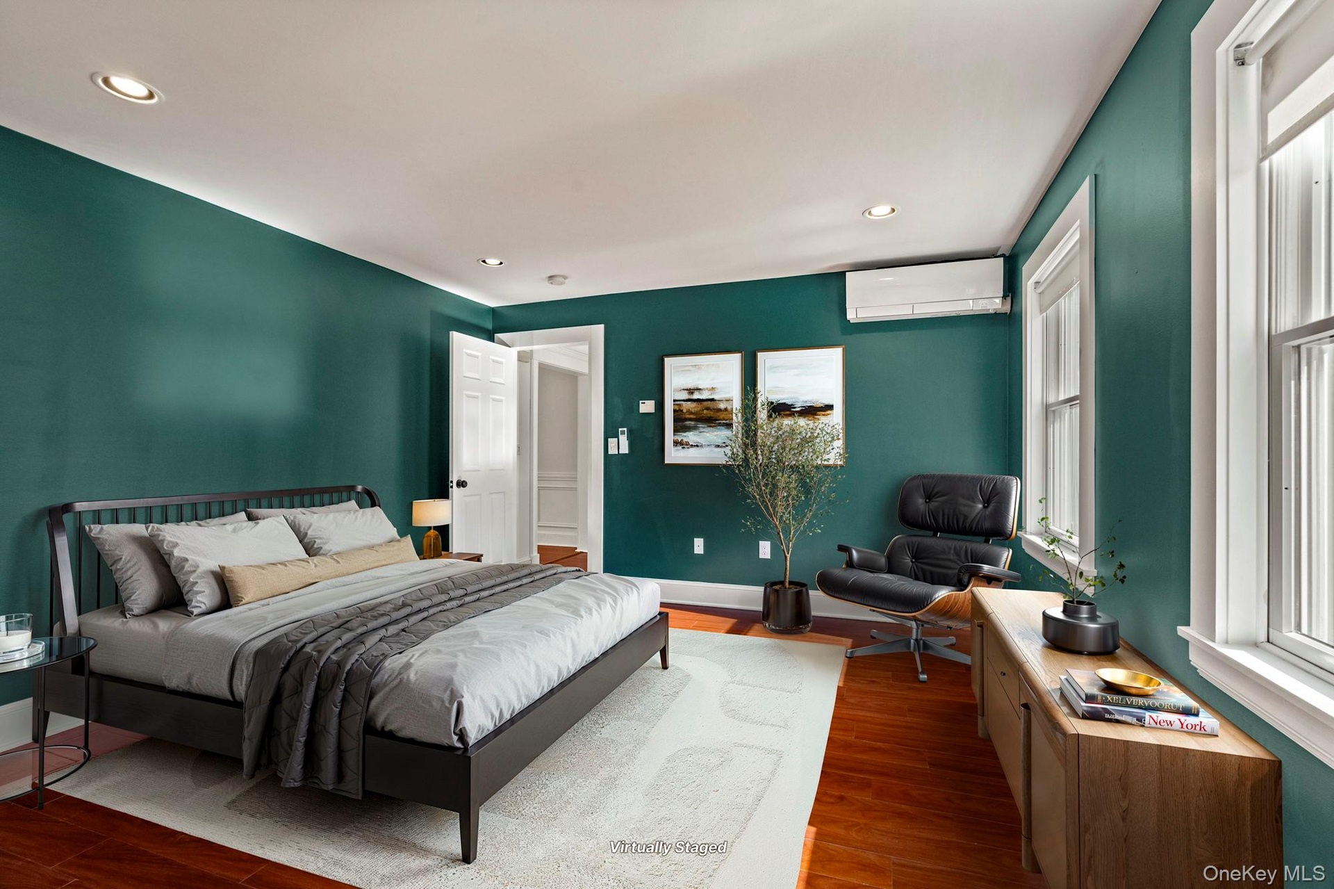 - Bedroom featuring a wall mounted air conditioner, recessed lighting, dark wood-type flooring, and baseboards