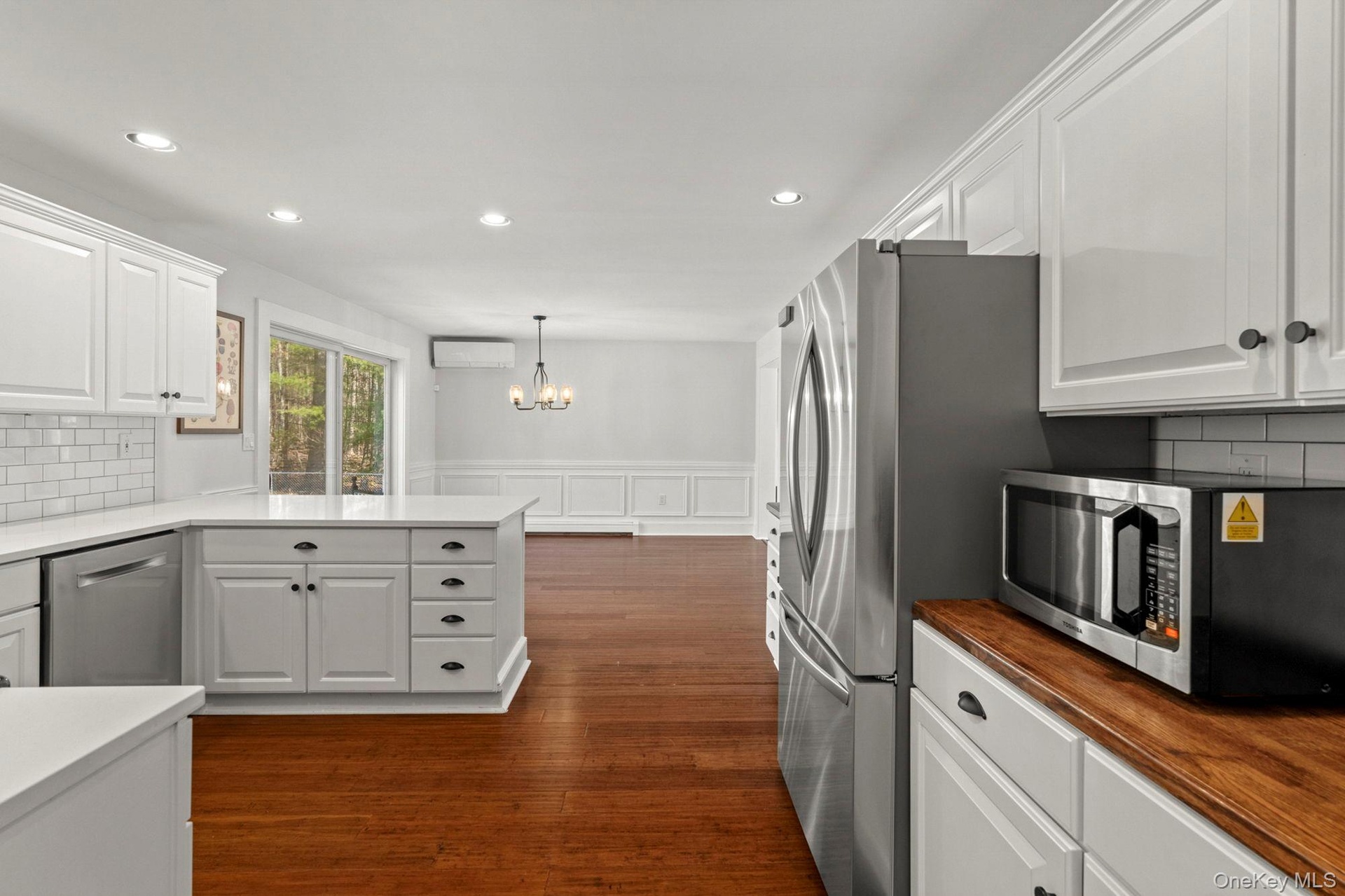 - Kitchen featuring appliances with stainless steel finishes, a chandelier, recessed lighting, white cabinets, and dark wood finished floors