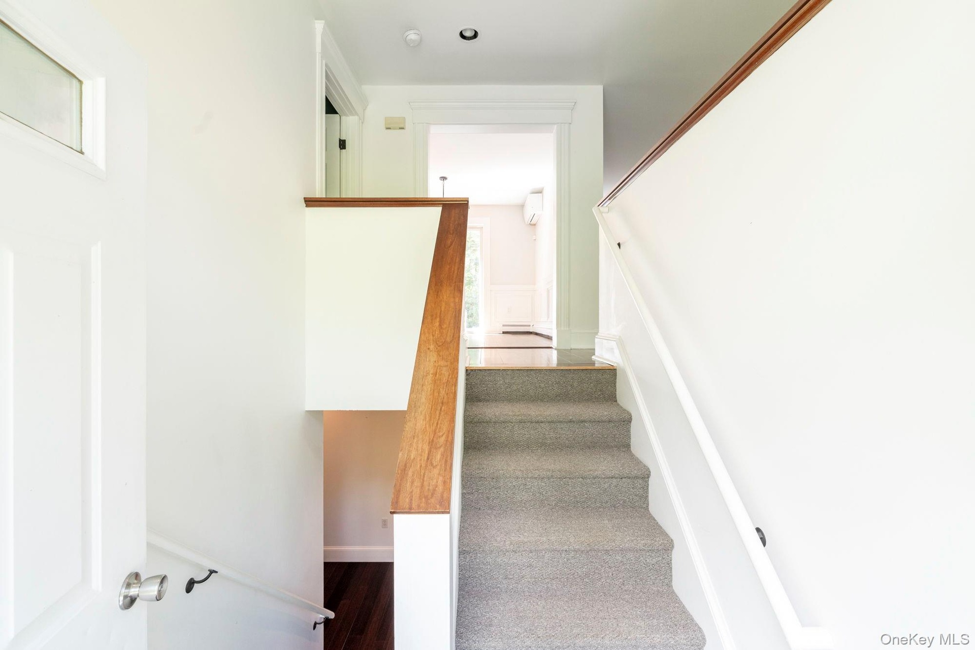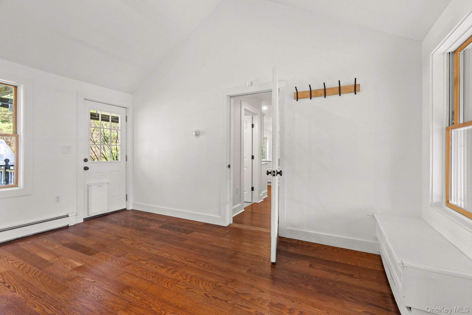- Entryway with vaulted ceiling, dark wood-style flooring, baseboards, and baseboard heating