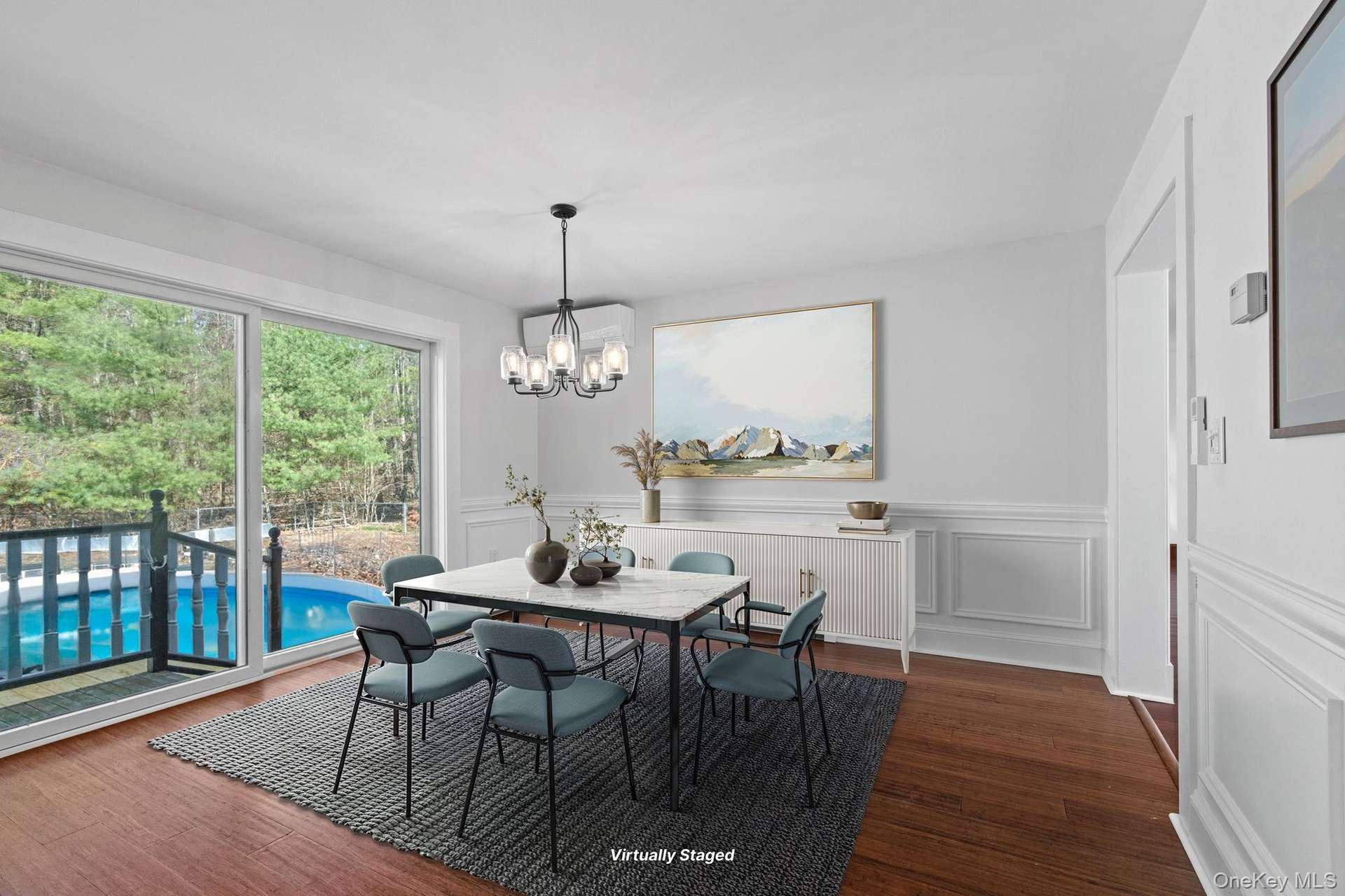 - Dining room with dark wood finished floors, a chandelier, radiator heating unit, a wainscoted wall, and a decorative wall