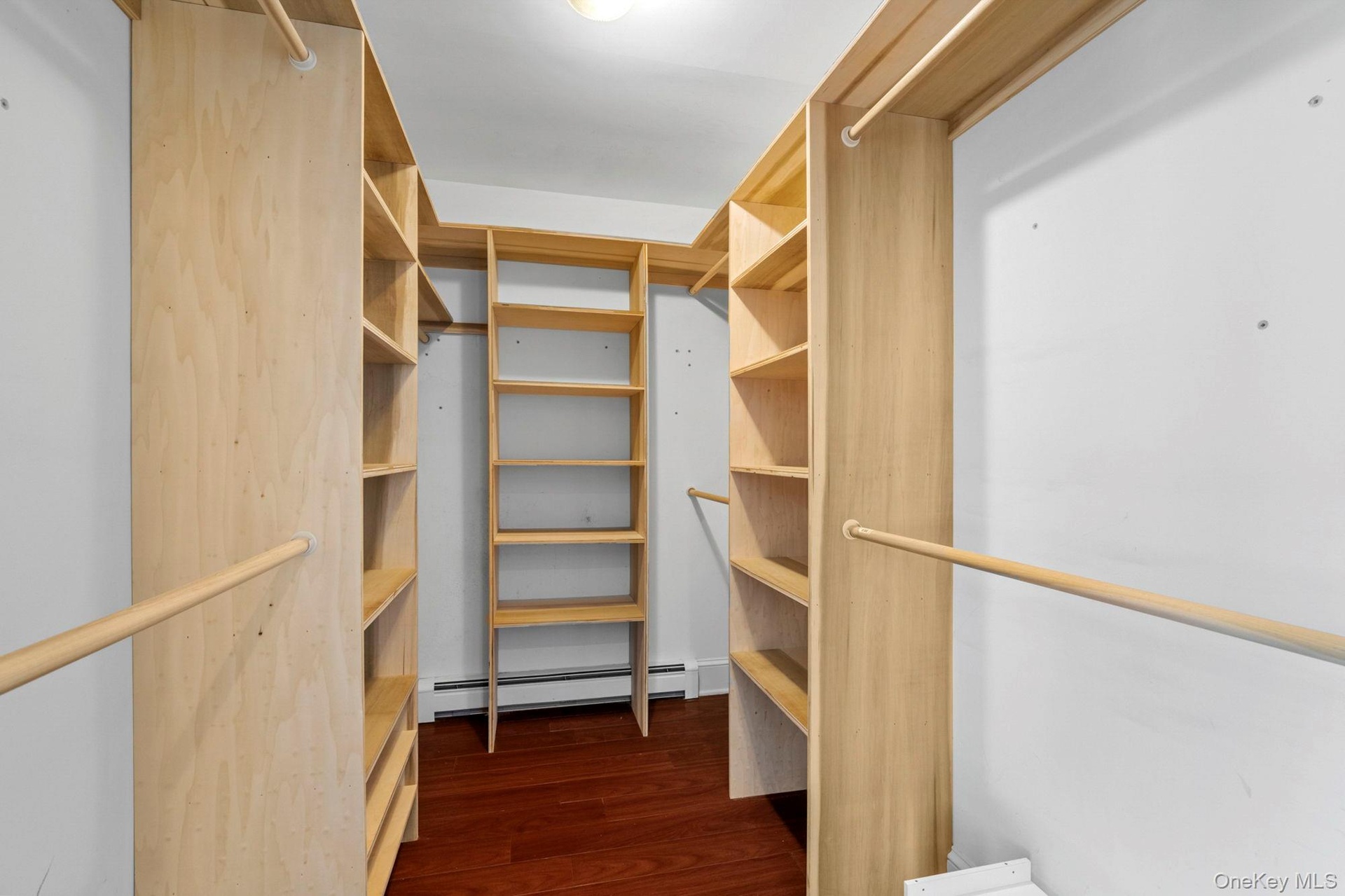 - Spacious closet with a baseboard heating unit and dark wood-style flooring