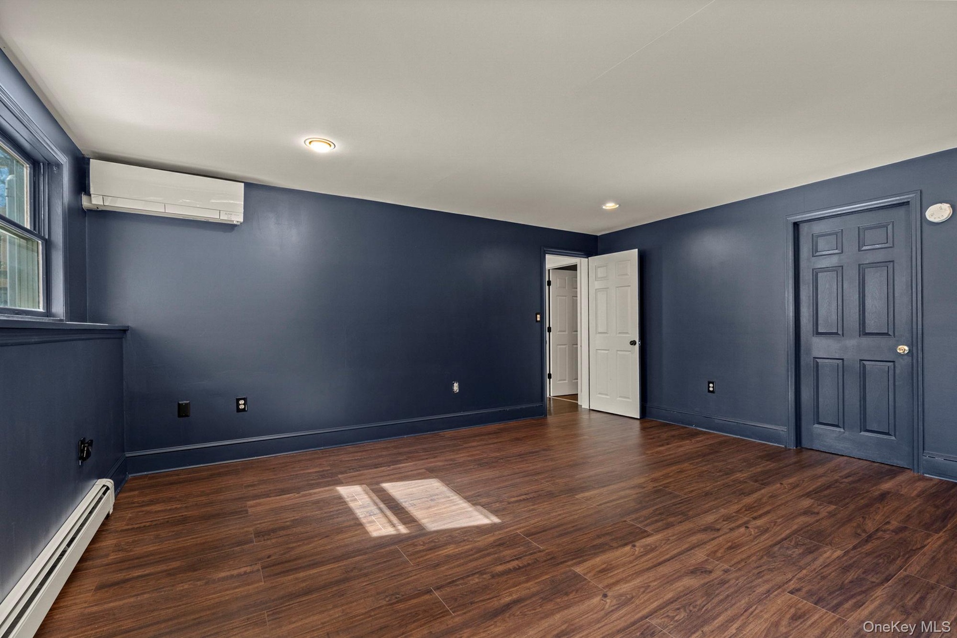 - Unfurnished bedroom with a baseboard heating unit, a wall mounted AC, wood finished floors, and baseboards