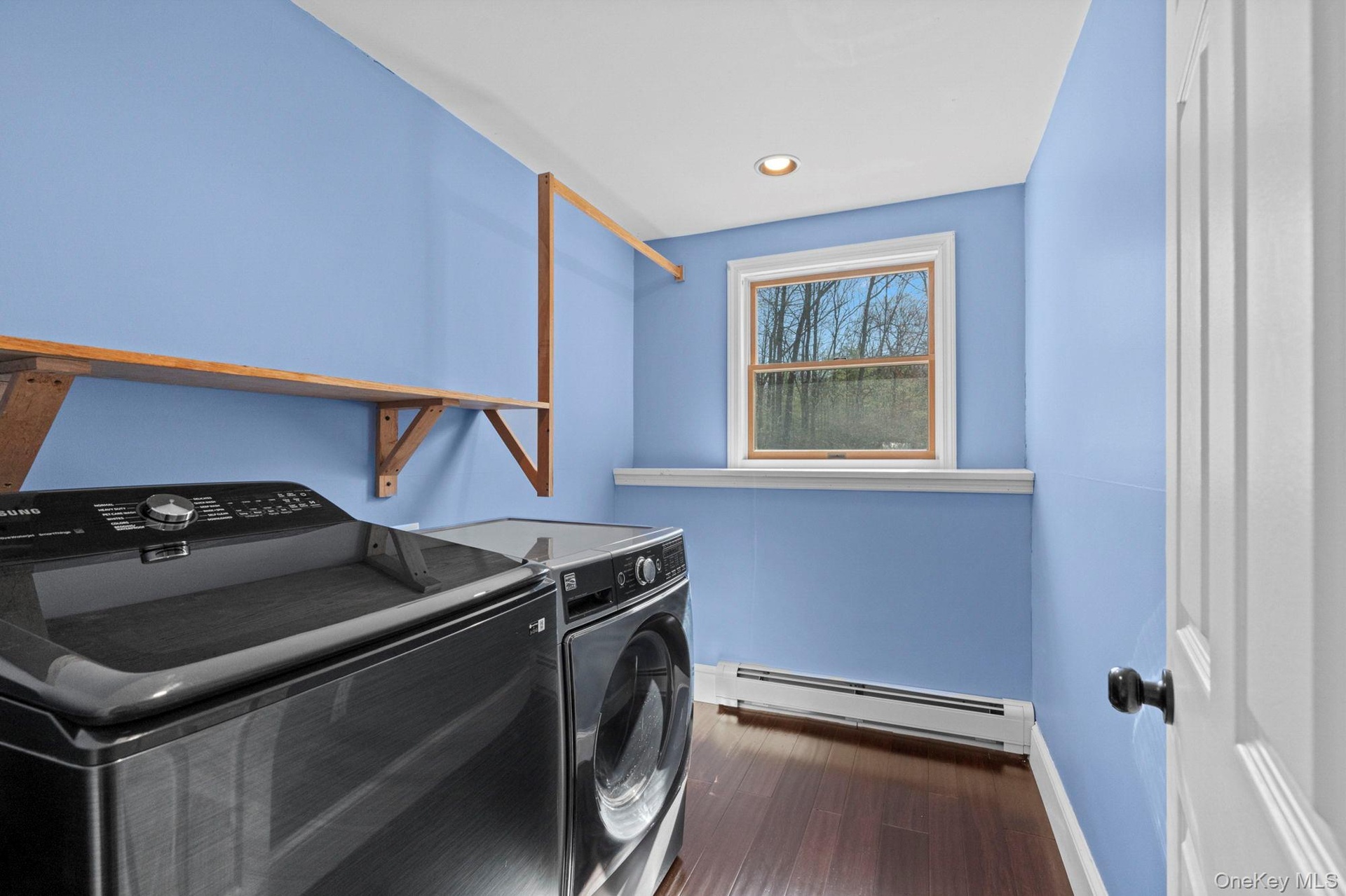 - Laundry area featuring baseboard heating, independent washer and dryer, baseboards, wood finished floors, and recessed lighting