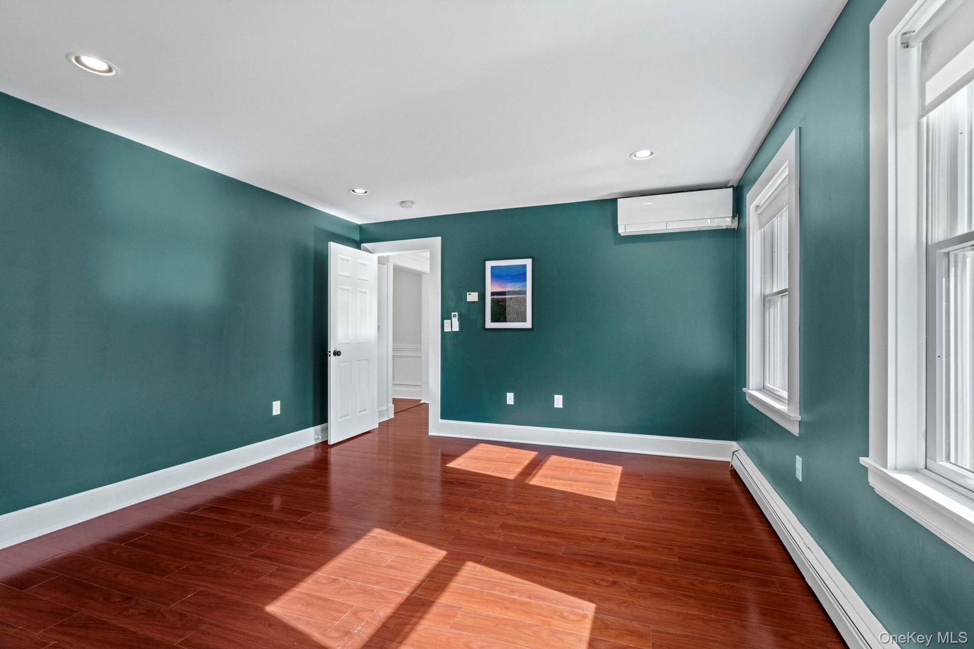 - Spare room with a baseboard radiator, an AC wall unit, wood finished floors, baseboards, and recessed lighting
