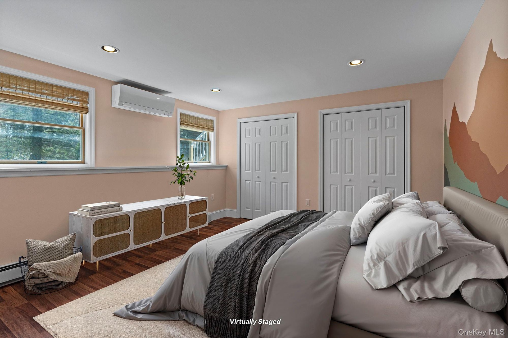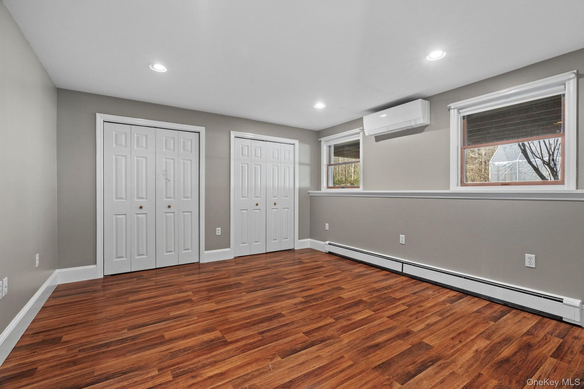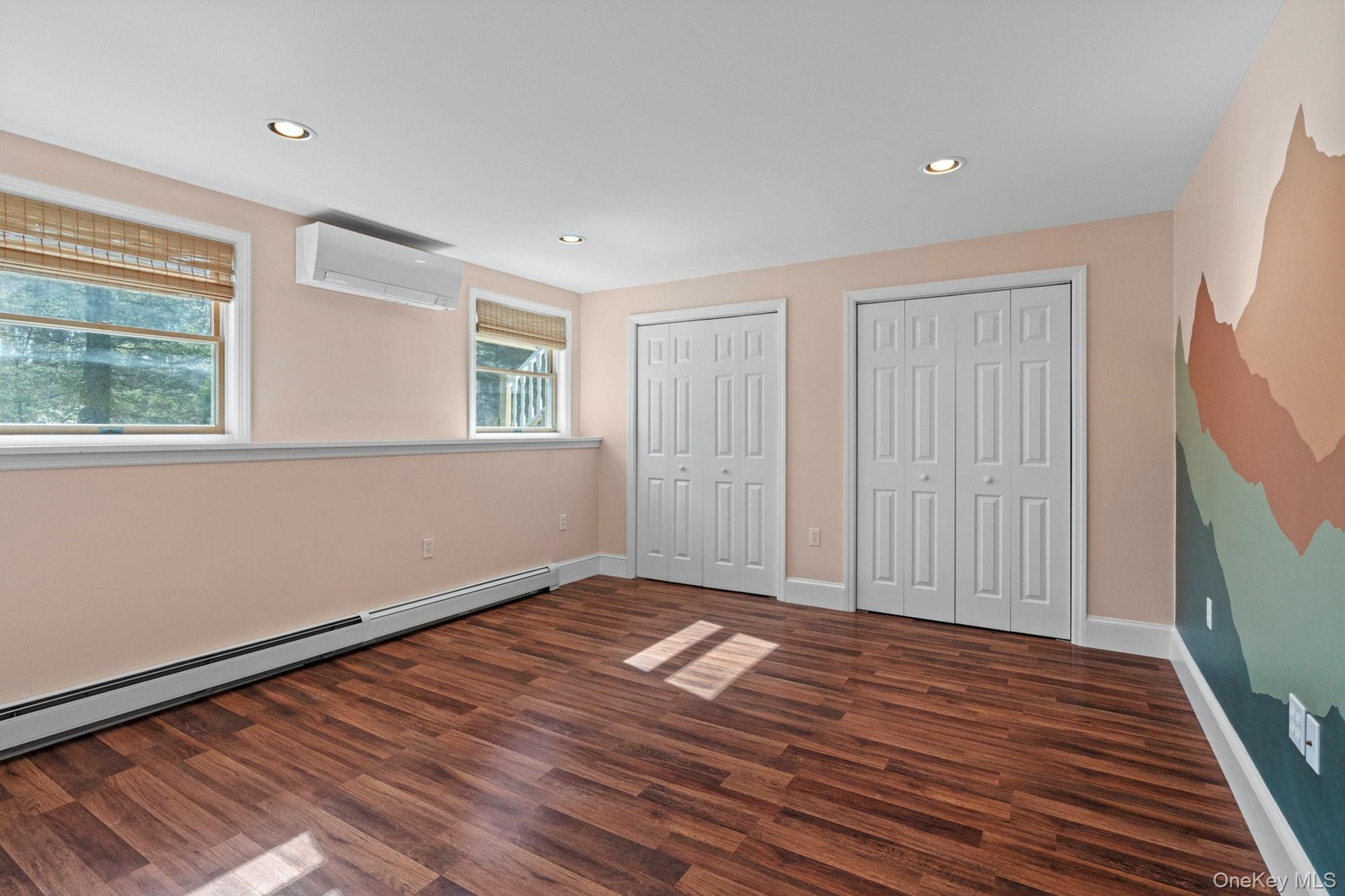 - Unfurnished bedroom featuring a baseboard heating unit, an AC wall unit, wood finished floors, two closets, and recessed lighting