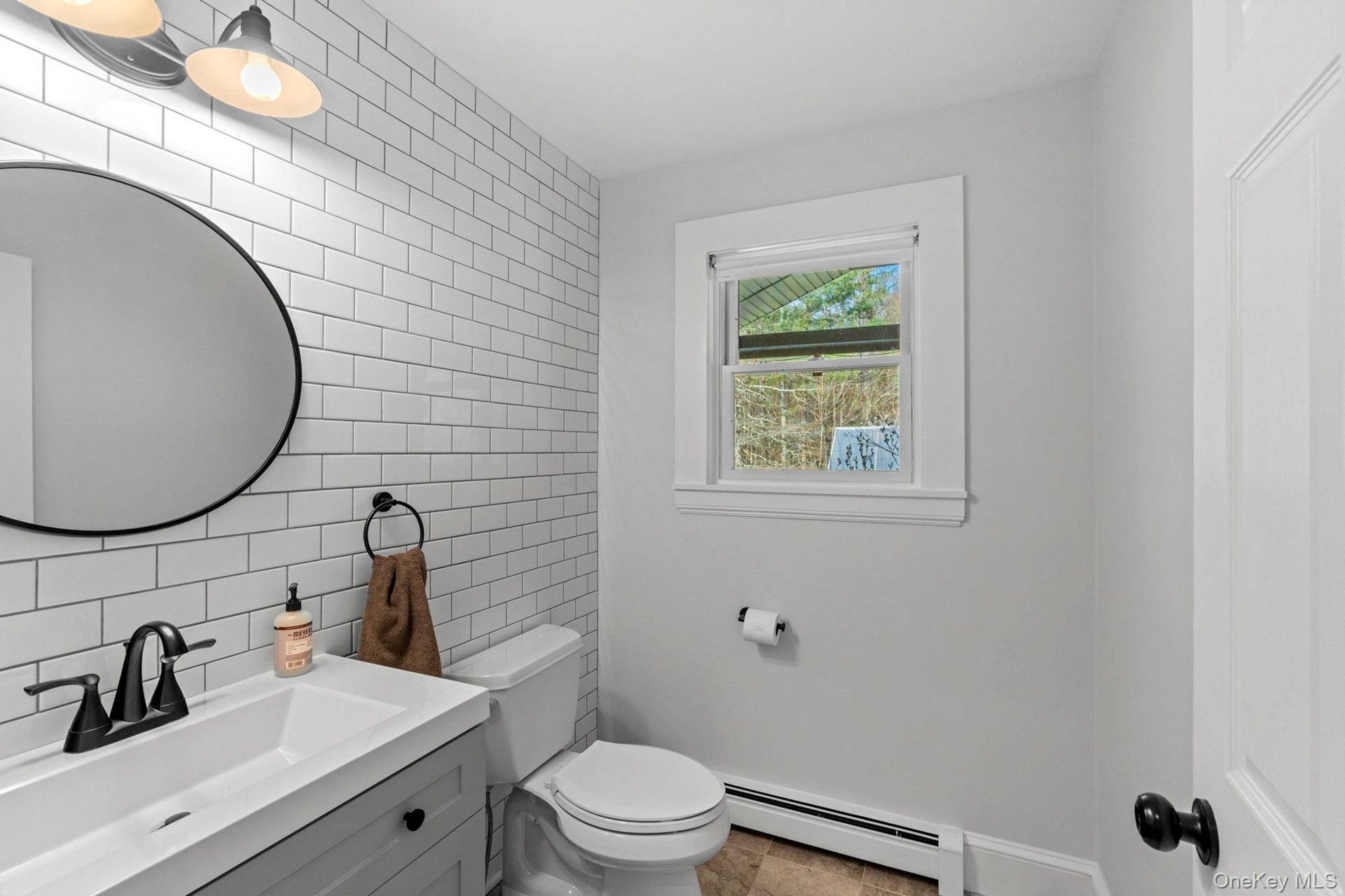 - Half bathroom with tile walls, baseboard heating, toilet, and vanity