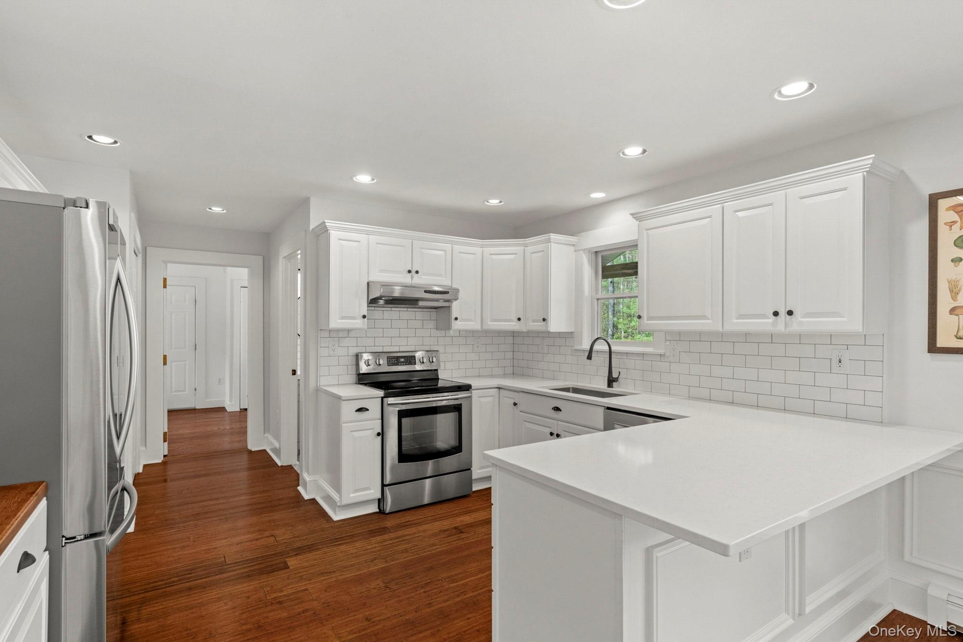 - Kitchen featuring stainless steel appliances, under cabinet range hood, a sink, a peninsula, and white cabinets