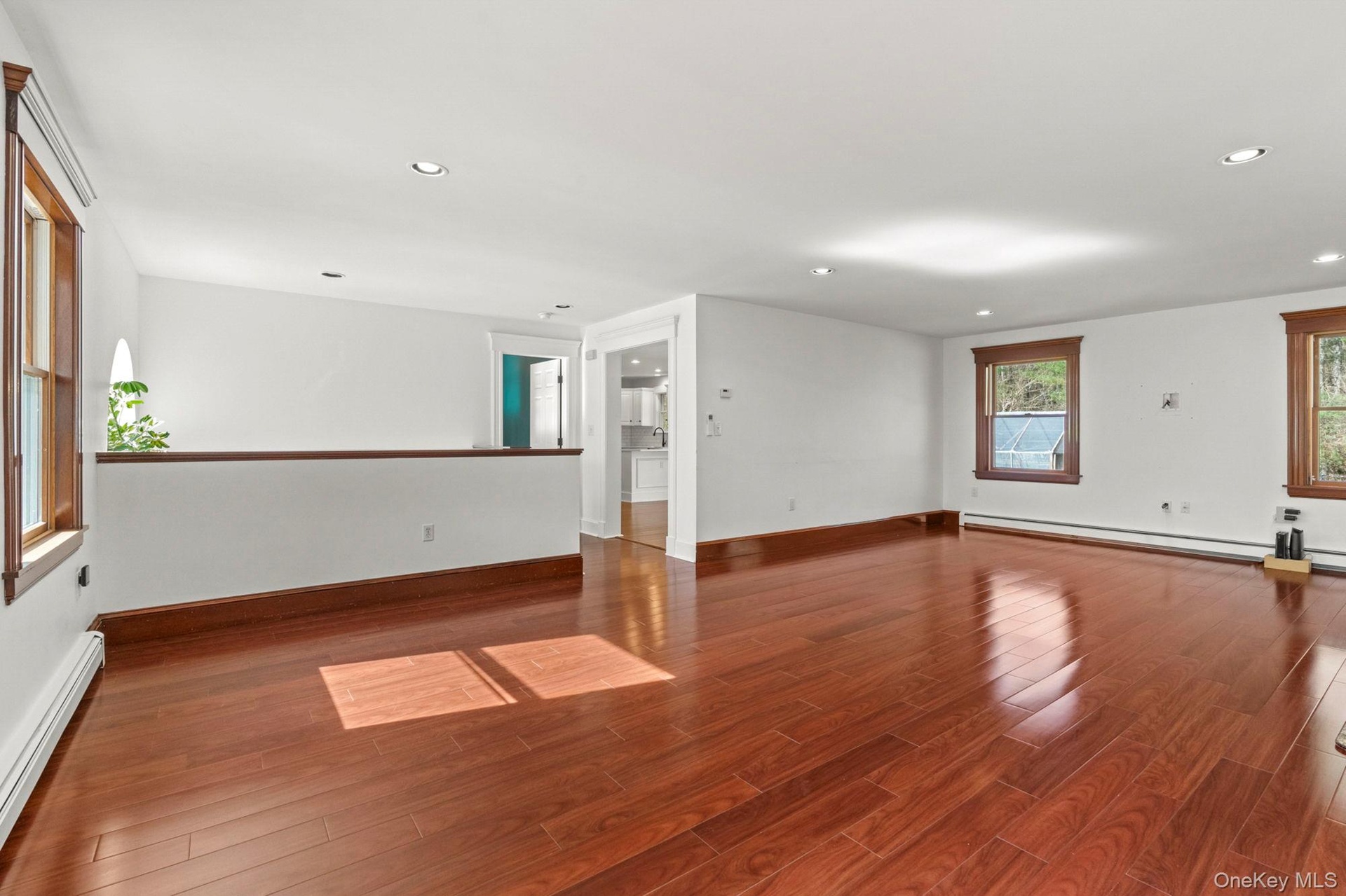 - Unfurnished living room with a baseboard heating unit, wood finished floors, baseboards, and recessed lighting