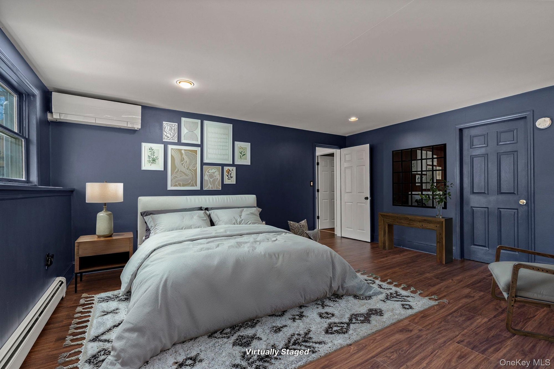 - Bedroom with a baseboard radiator, a wall unit AC, wood finished floors, and baseboards