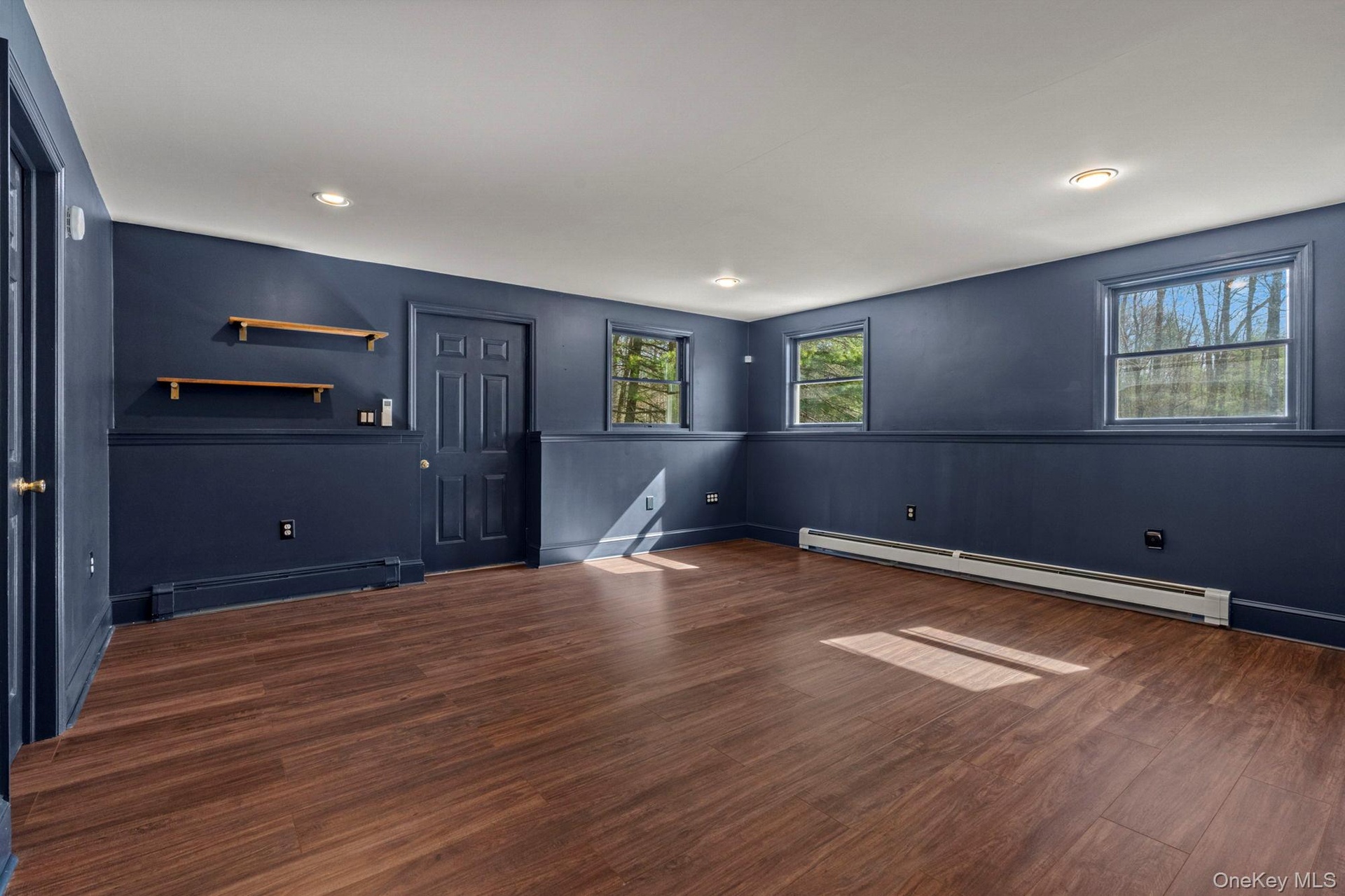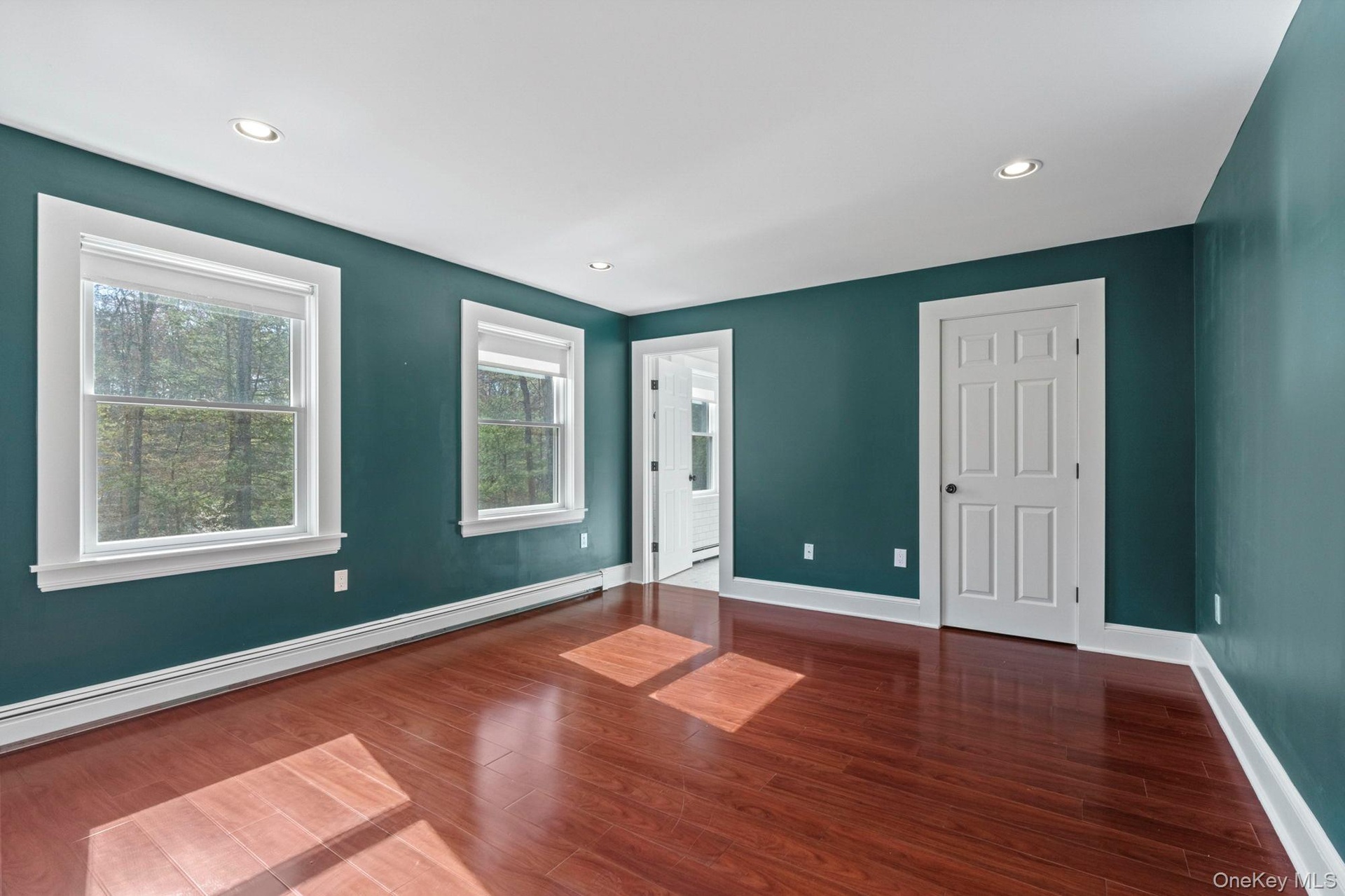 - Unfurnished room with a baseboard radiator, baseboards, wood finished floors, and recessed lighting
