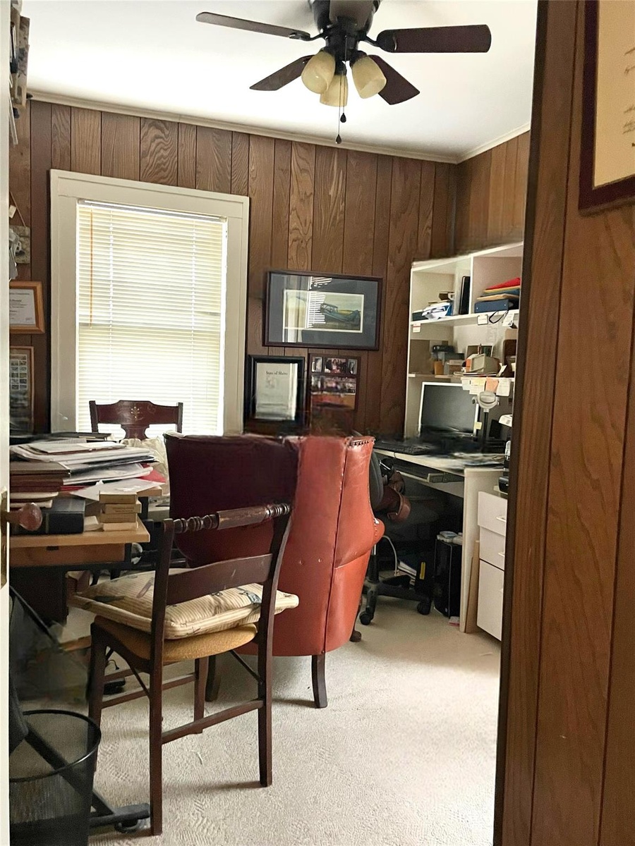 - Office space with ceiling fan, light carpet, and wooden walls