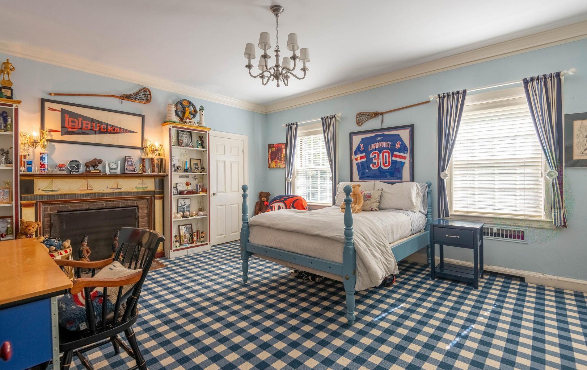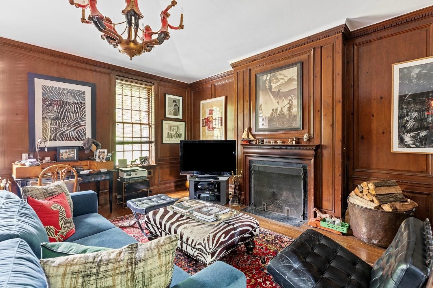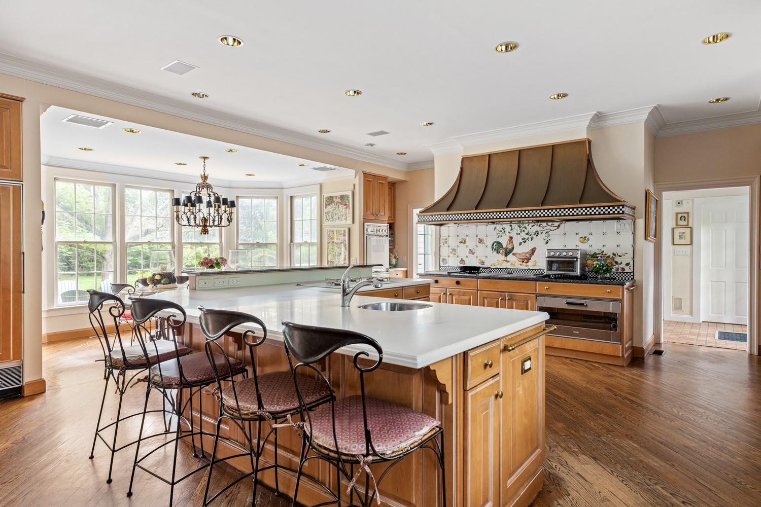 The formal living room, anchored by a wood-burning fireplace, opens via French doors into a sun-drenched solarium—perfect for morning coffee or peaceful afternoon reading. A second set of French doors in the cozy den leads directly to the manicured gardens, while the adjacent library, wrapped in gleaming chestnut paneling, offers a warm retreat with its own fireplace. The formal dining room is a study in craftsmanship, featuring exquisite millwork and a striking fireplace mantle. The chef’s kitchen offers both functionality and style, complete with a charming informal dining area overlooking the gardens.