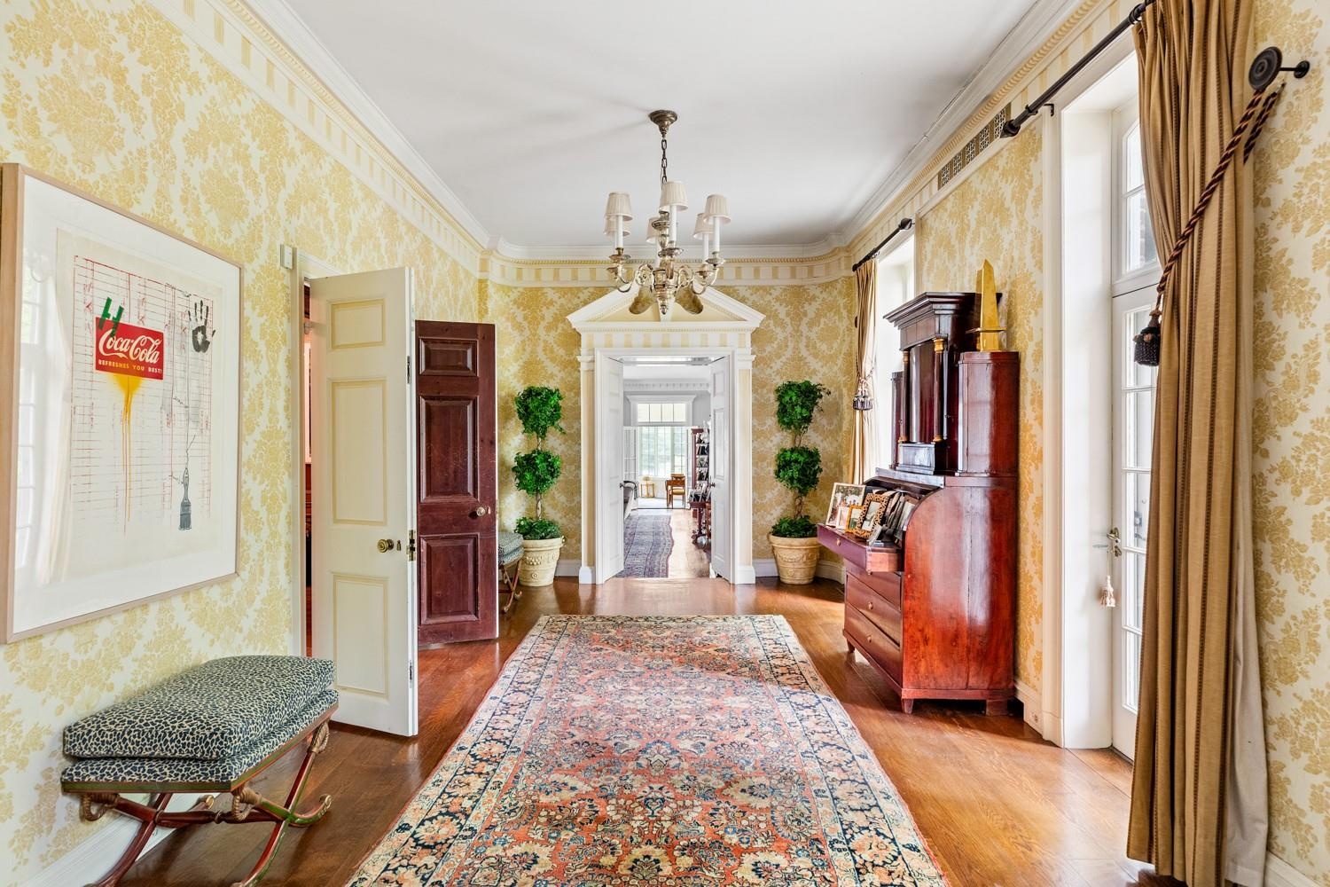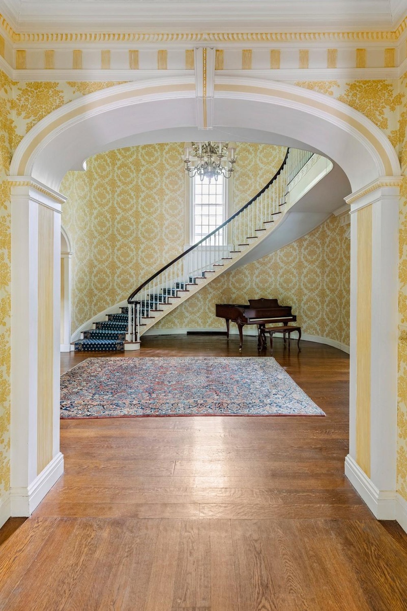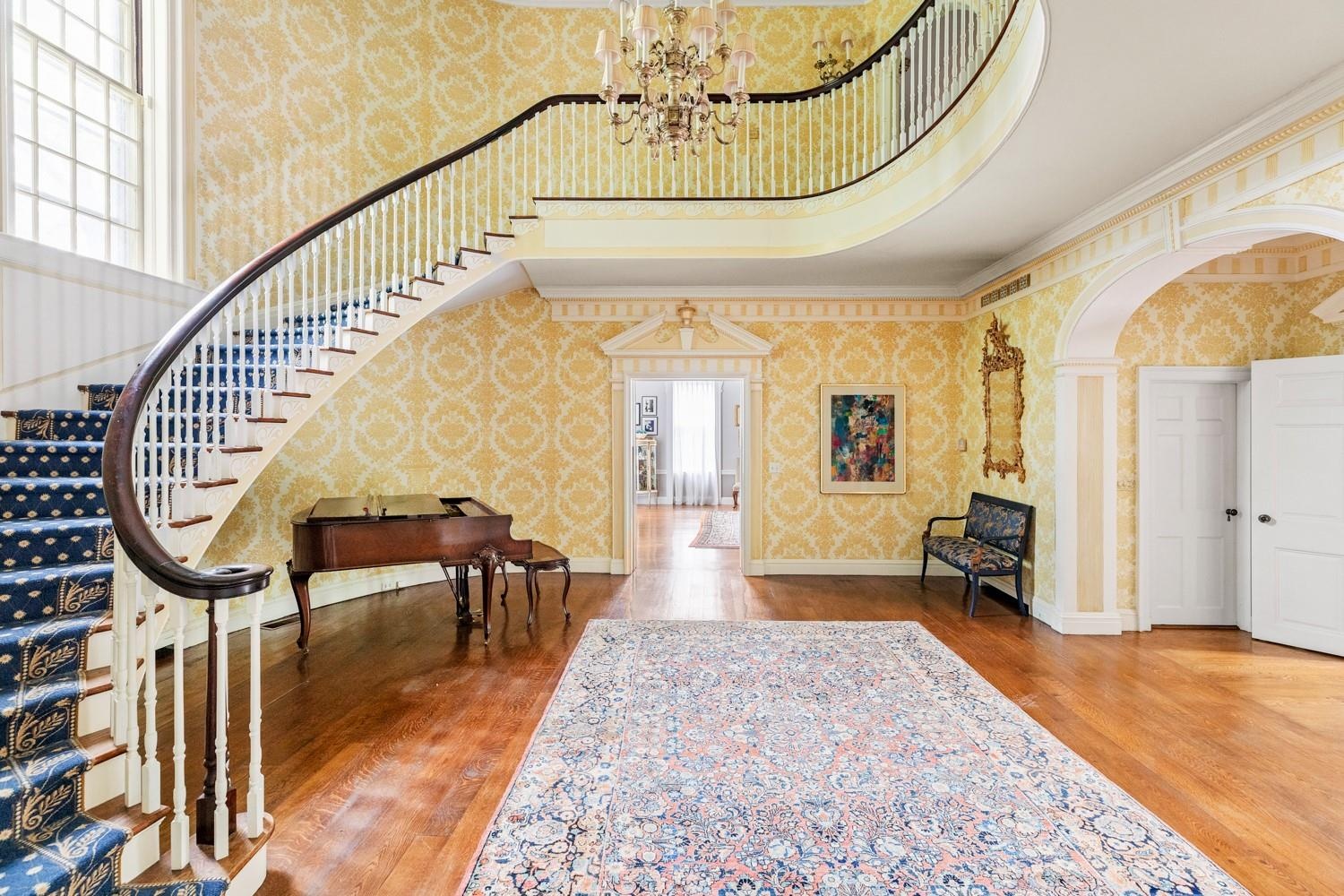 Inside, a grand double-height foyer with hand-carved moldings and a gracefully curved staircase sets a tone of refined elegance. Period details abound throughout the home, showcased in expansive principal rooms with soaring ceilings and an effortless, flowing layout ideal for entertaining and everyday living.