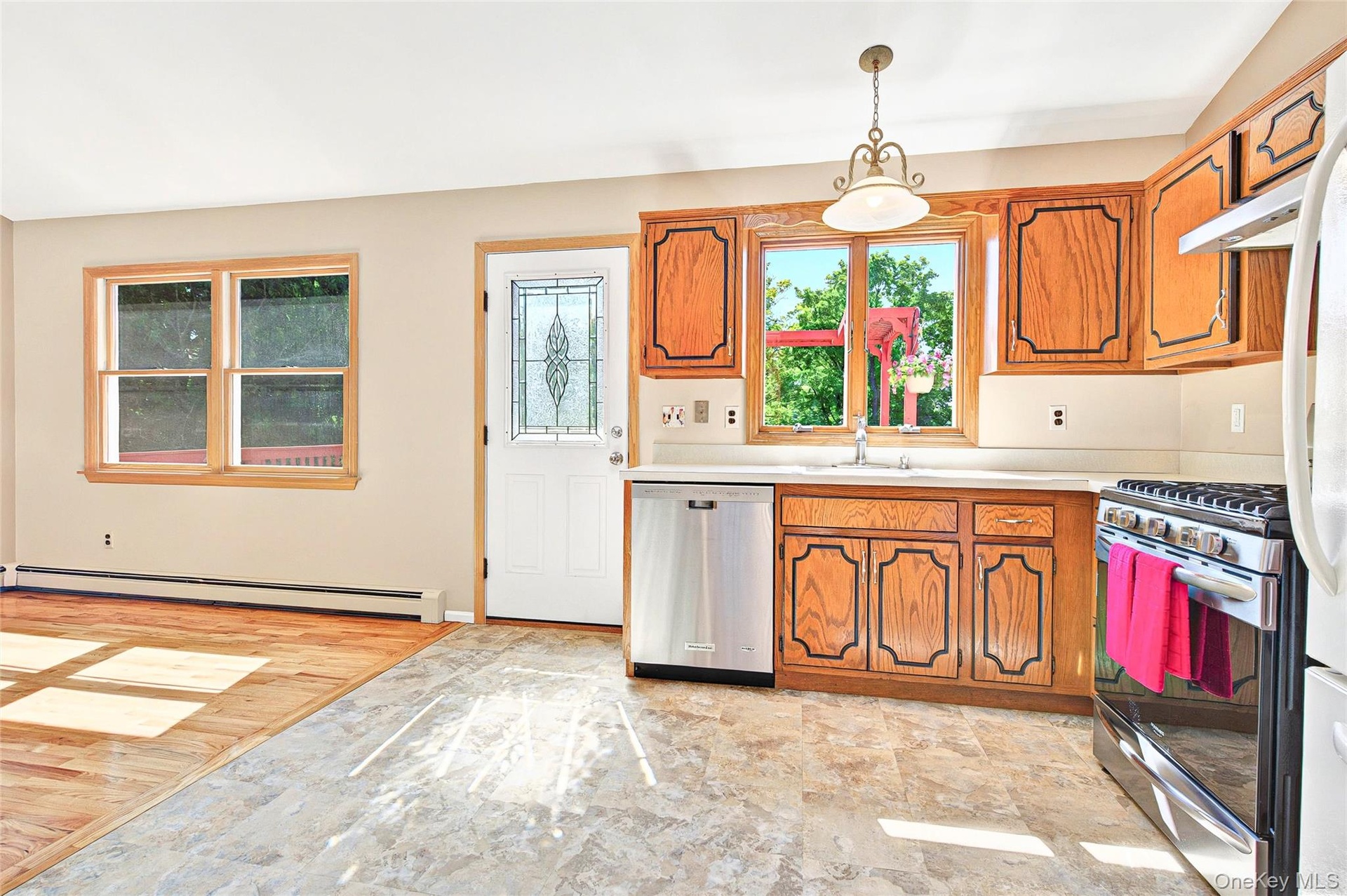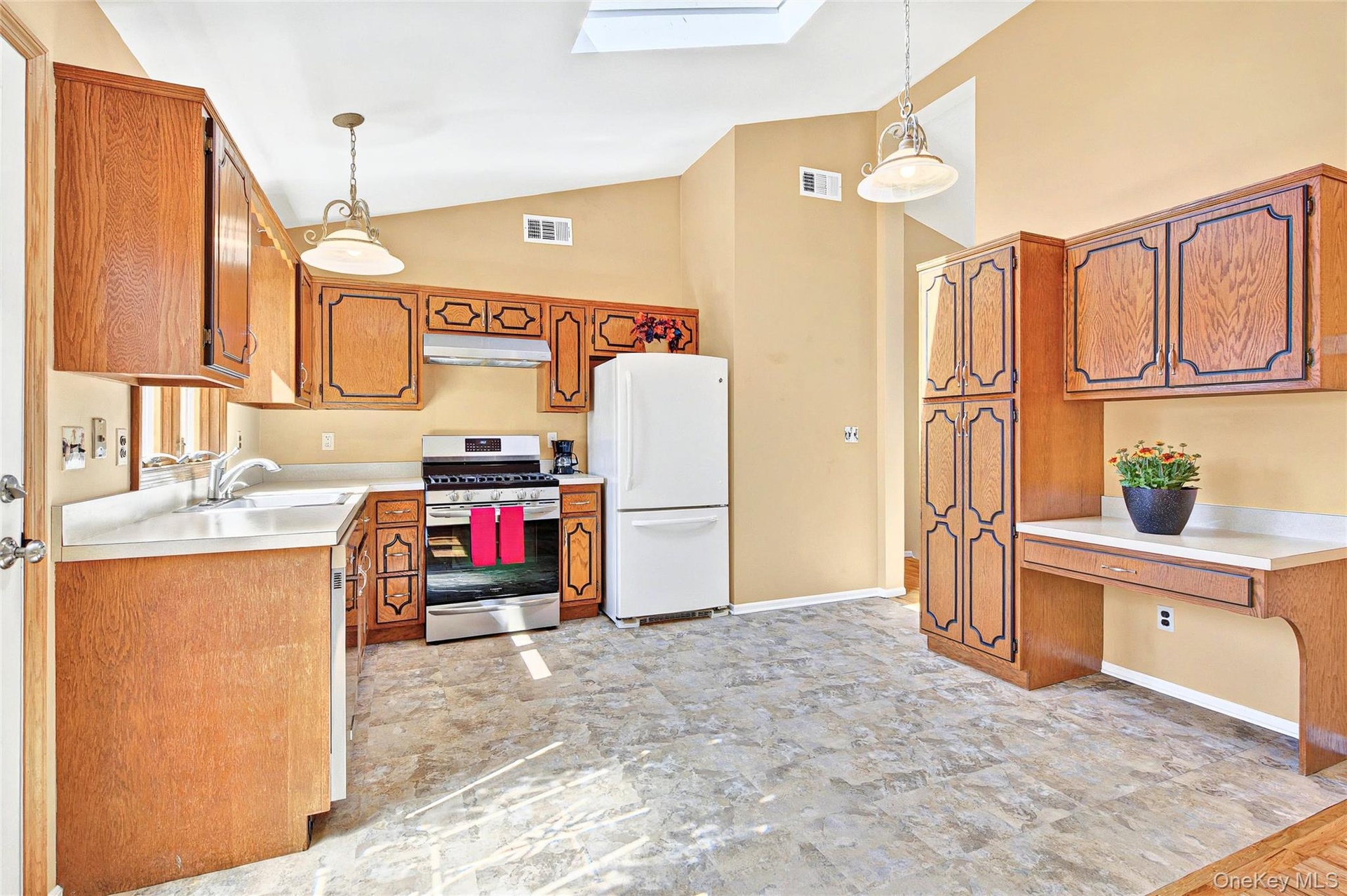 - Kitchen featuring wood cabinets, stainless steel appliances & skylight.