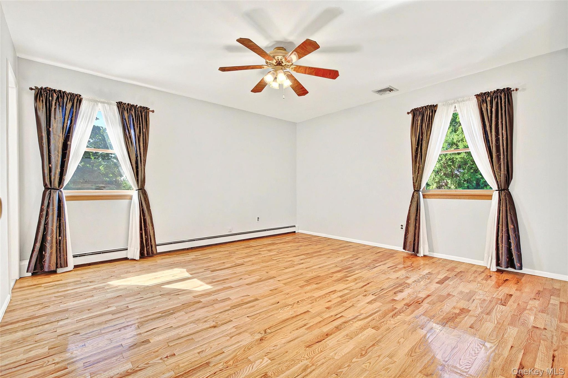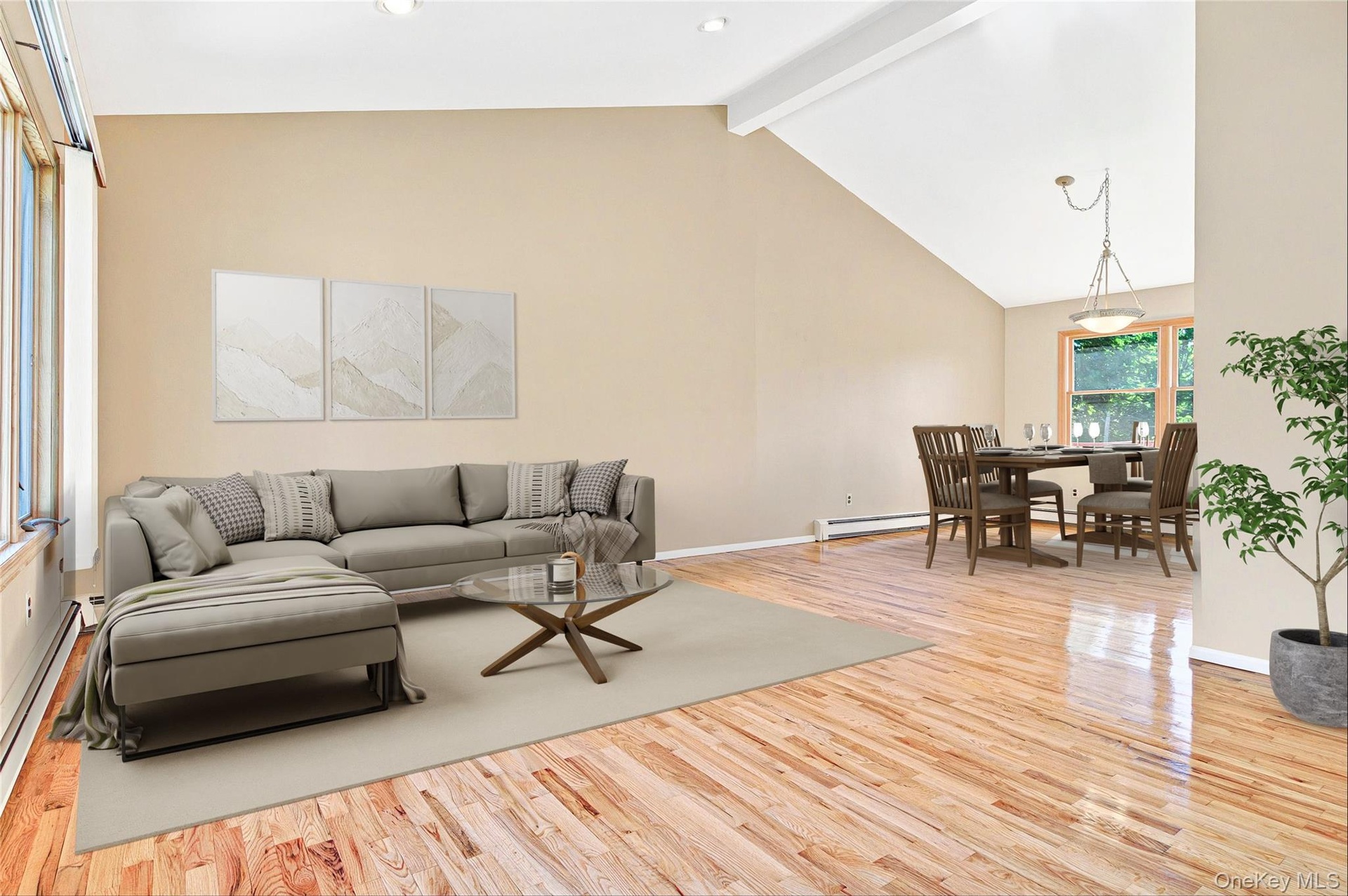 - Living room with casement windows, gleaming hardwood floors & recessed lighting.