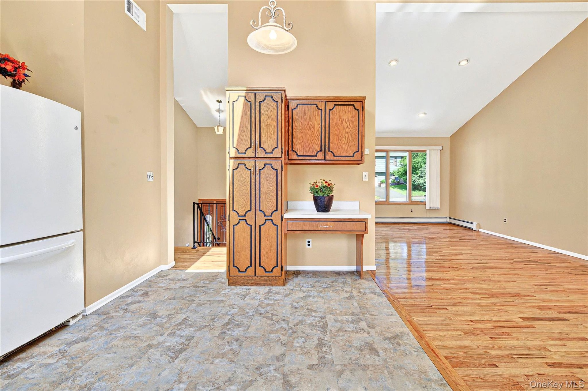 - Kitchen featuring wood cabinets with pantry with pull out drawers & a built in desk.