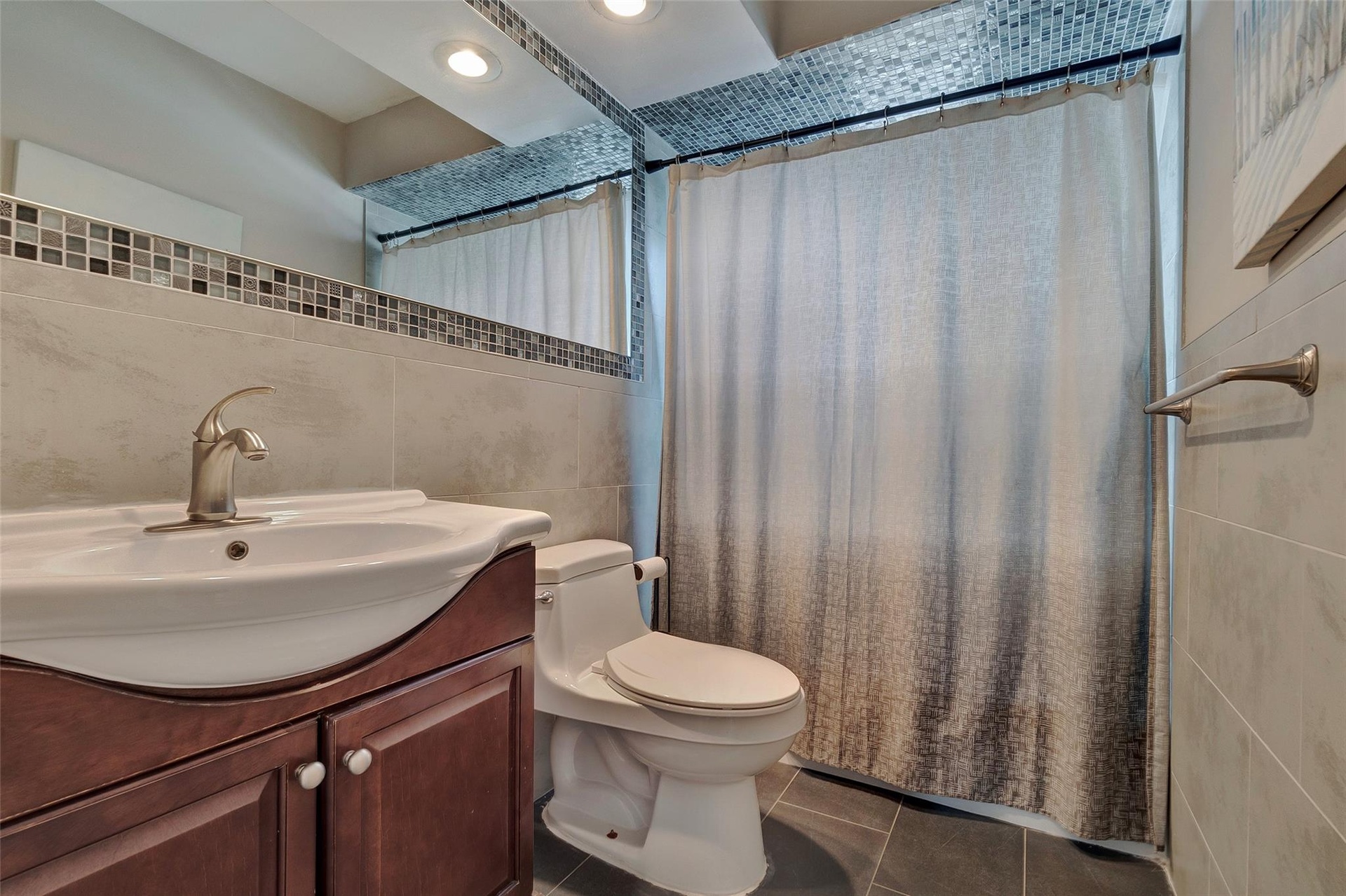 - Bathroom featuring tile walls, tile patterned floors, toilet, vanity, and a shower with curtain
