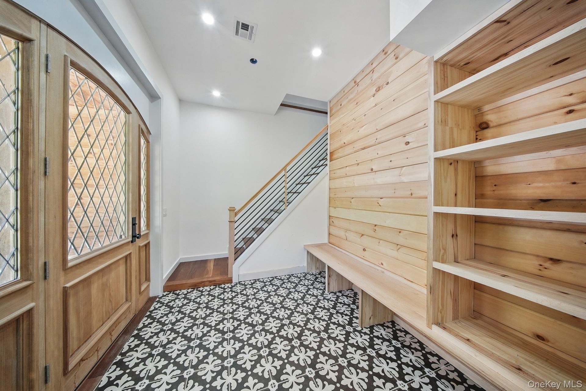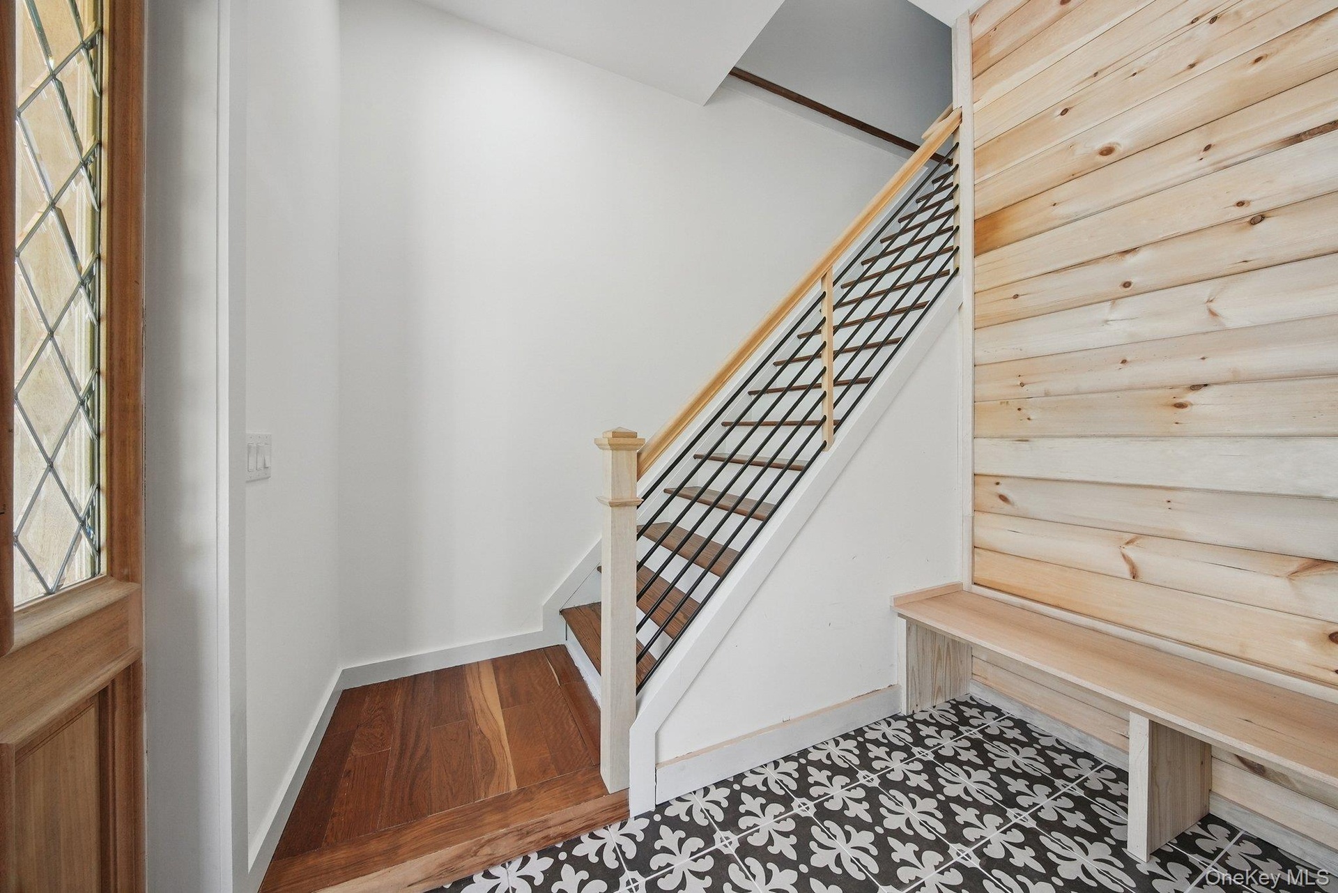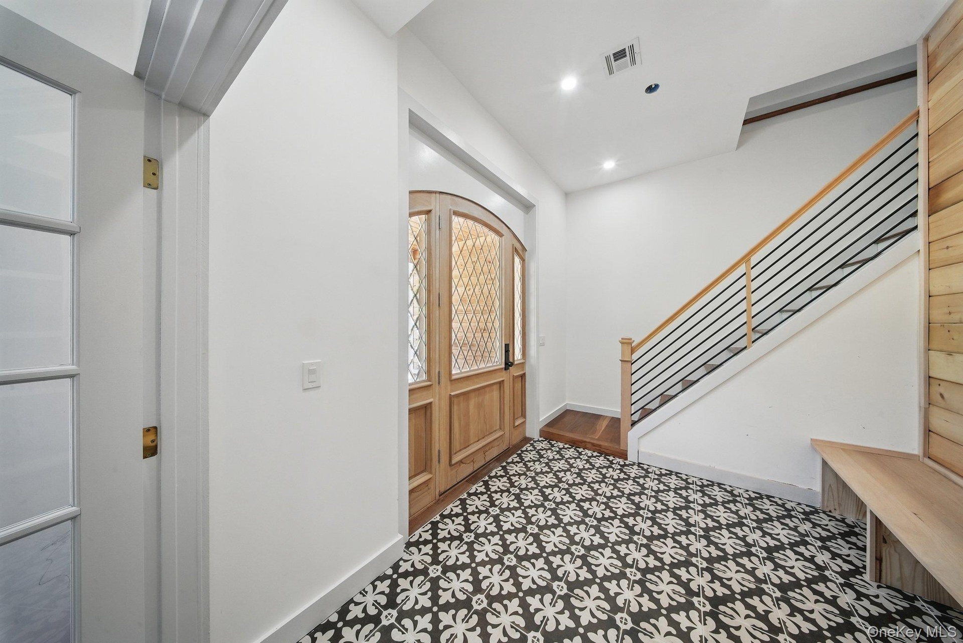- Entryway featuring stairway, tile patterned floors, recessed lighting, and baseboards